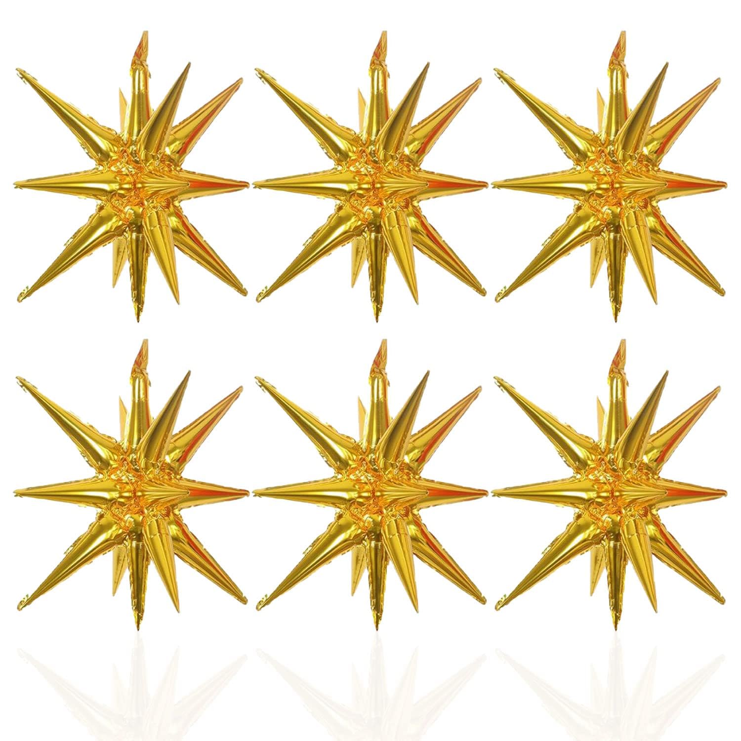 6 Pcs Gold Star Foil Balloons One-Piece 14-Pointed Star Balloons 4D Starburst Cone Mylar Balloons 22Inch Christmas Birthday Wedd