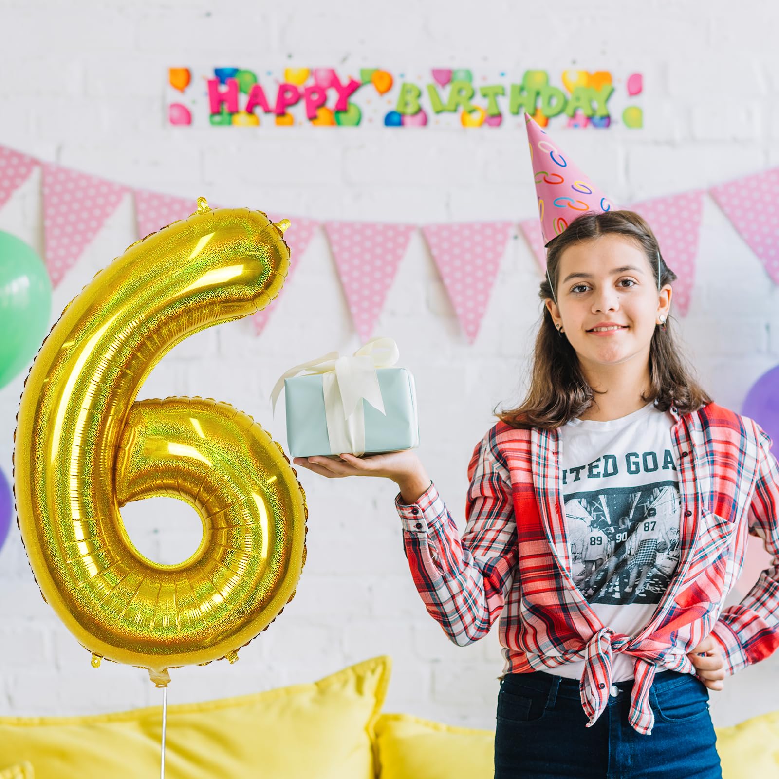 6 Year Old Birthday Balloons For Kids, Laser Gold Self Inflating Giant Mylar Number 6 Balloons, Foil Iridescent Globos Dorados 4