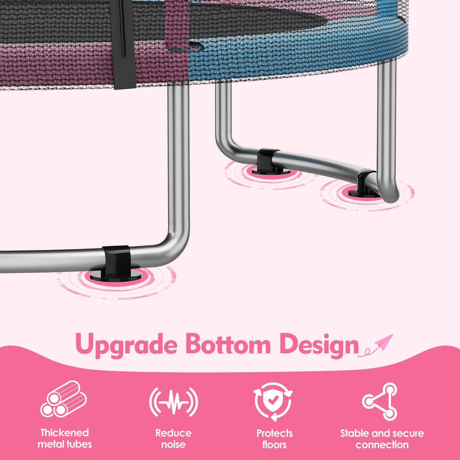 - Q: How do I ensure the trampoline remains stable during use? A: The trampoline is equipped with three U-shaped legs and suction cup pads to enhance stability while in use.