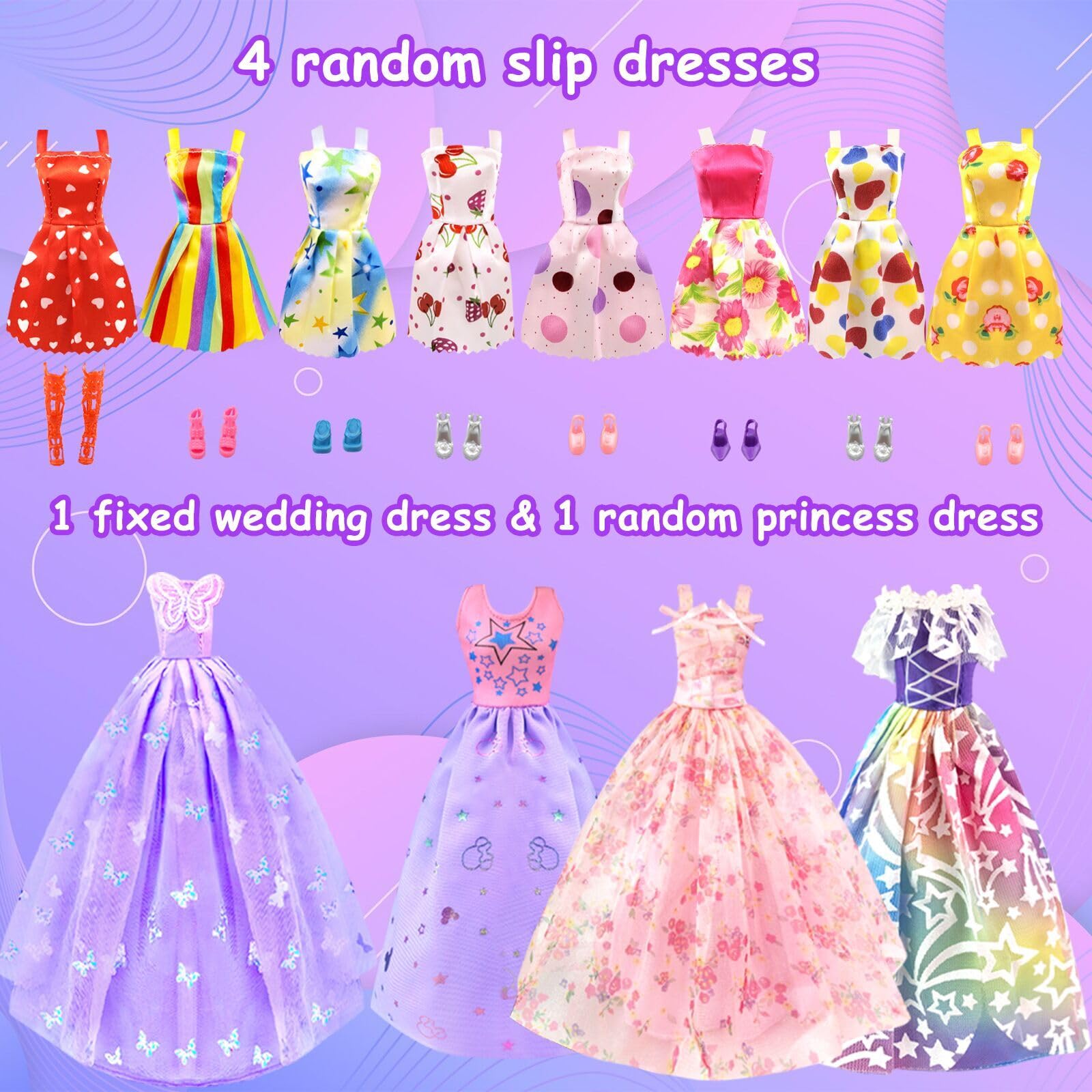 - Q: What items are included in the doll playset? A: The set includes 1 doll, a purple doll closet, a shoe rack, various outfits including party and princess dresses, tops, pants, mini dresses, bags, and a variety of 40 doll accessories such as necklaces, hangers, flowers, and hearts.