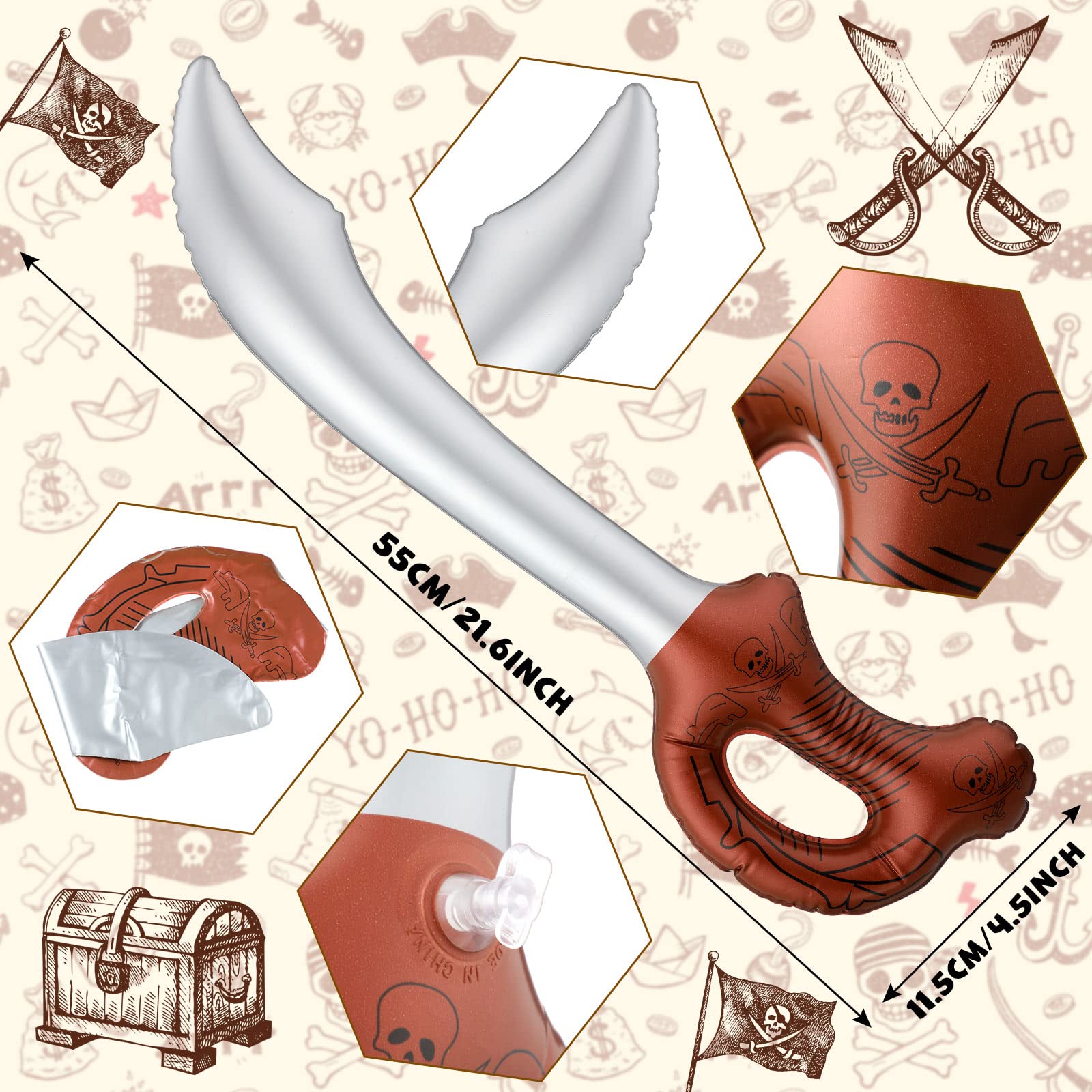 Features: The kid's pirate costumes come with skeleton design on the surface of ring eye patch and decorative replica blade which can make the wearer look like a real pirate adding more fun to your role play parties and sailing themed parties. The pirate kit for kids is well made and interesting suitable for boys and girls ideal for Halloween and can be widely applied on various occasions like role play parties performances themed parties and so on bringing joy to kids playing time. Specifications: Bandana material: cotton Wrist sash material: polyester decorative replica blade material: PVC and plastic Color: as pictures shown Size: as pictures shown Quantity: 7 pieces Package includes: 1 x Pirate bandana 1 x Pirate sash 1 x Inflatable pirate decorative replica blade 1 x Pirate eye patch 1 x Gold pirate earring 1 x Pirate ring 1 x Pirate coin bag Notes: Manual measurement please allow slight errors on size. The color may exist a slight difference due to different screen displays. Winding risk may exist keep away from kids under 3 years old. Kids should play under the watchful eye of mature-themeds.