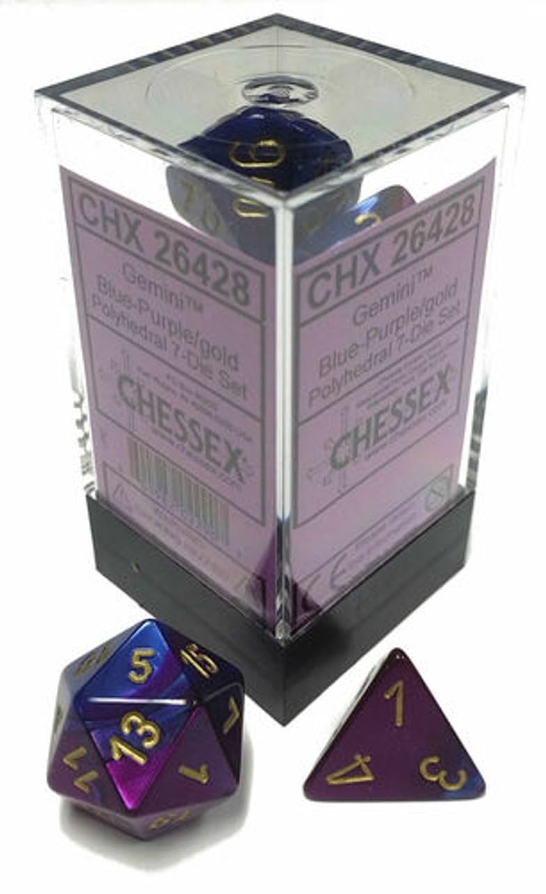 - Q: What colors are featured in the Chessex CHX26428 Dice-Gemini Set? A: The Chessex CHX26428 Dice-Gemini Set features a striking combination of blue, purple, and gold colors, making them visually appealing for any gamer.