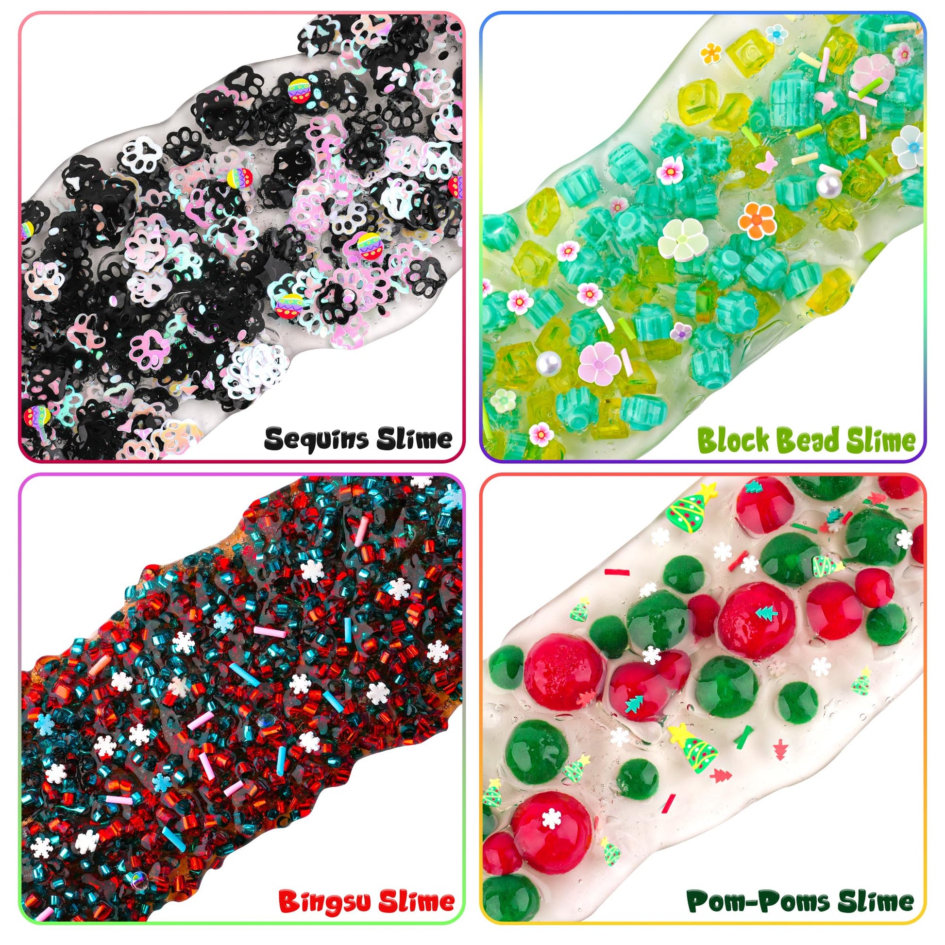 • Q: What types of slime are included in the 8 Pack Slime Kit? A: The 8 Pack Slime Kit features a variety of 8 different textures including butter slime, cloud slime, clear pom-poms slime, bingsu slime, gold foil slime, sequins slime, dino eggs slime, and block bead slime.