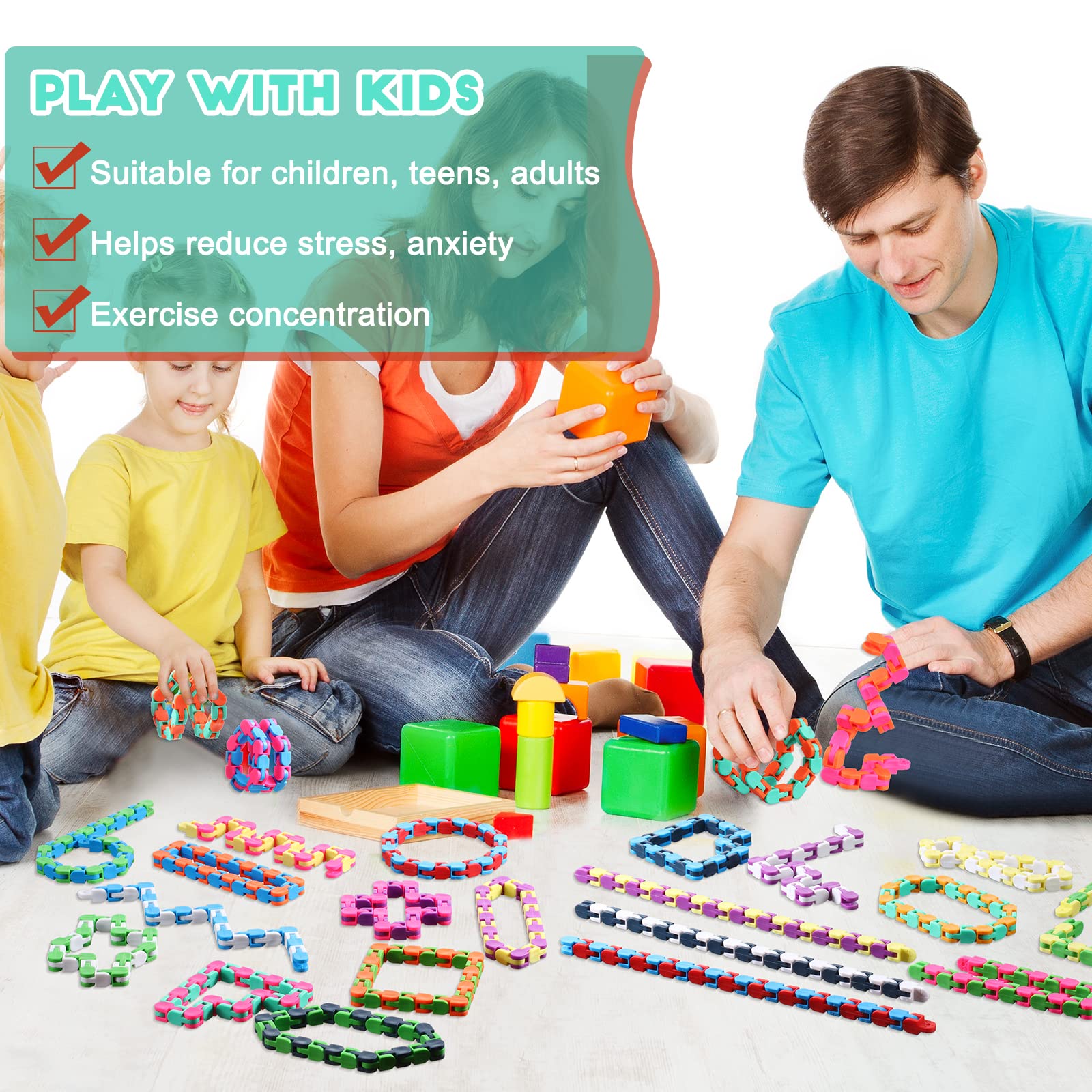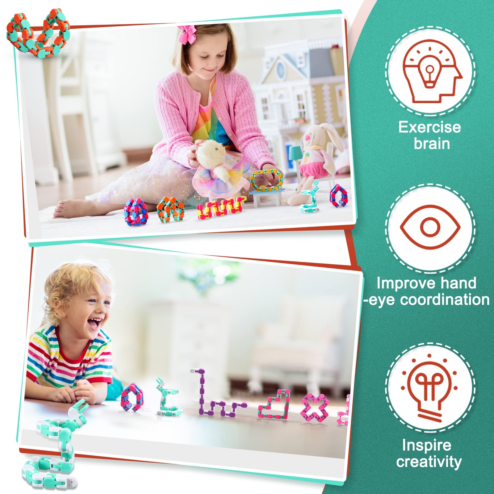 Features: 24 Links fidgets for teens are colorful and flexible to play ideal for basket fillers stocking fillers birthday party favors Christmas gifts classroom prizes and more. Snap fidget is a great toy for stress relief stimulate creativity and improve hand eye coordination suitable for most teens and mature-themeds. Specifications: Material: plastic Color: as picture shown Size: 11 inches Package includes: 80 x Wacky fidget toy Notes: Manual measurement please allow slight errors on size. The color may exist a slight difference due to different screen displays.