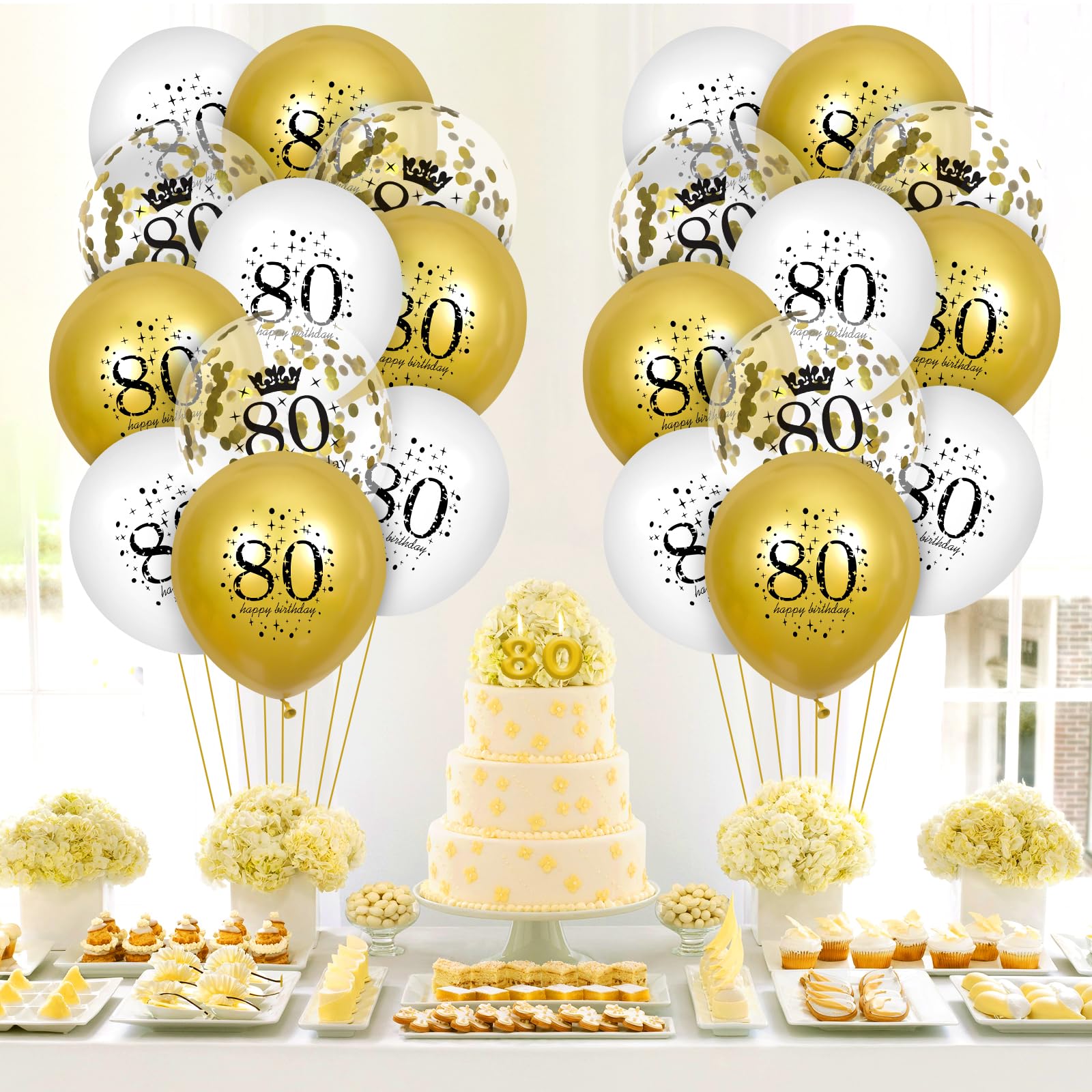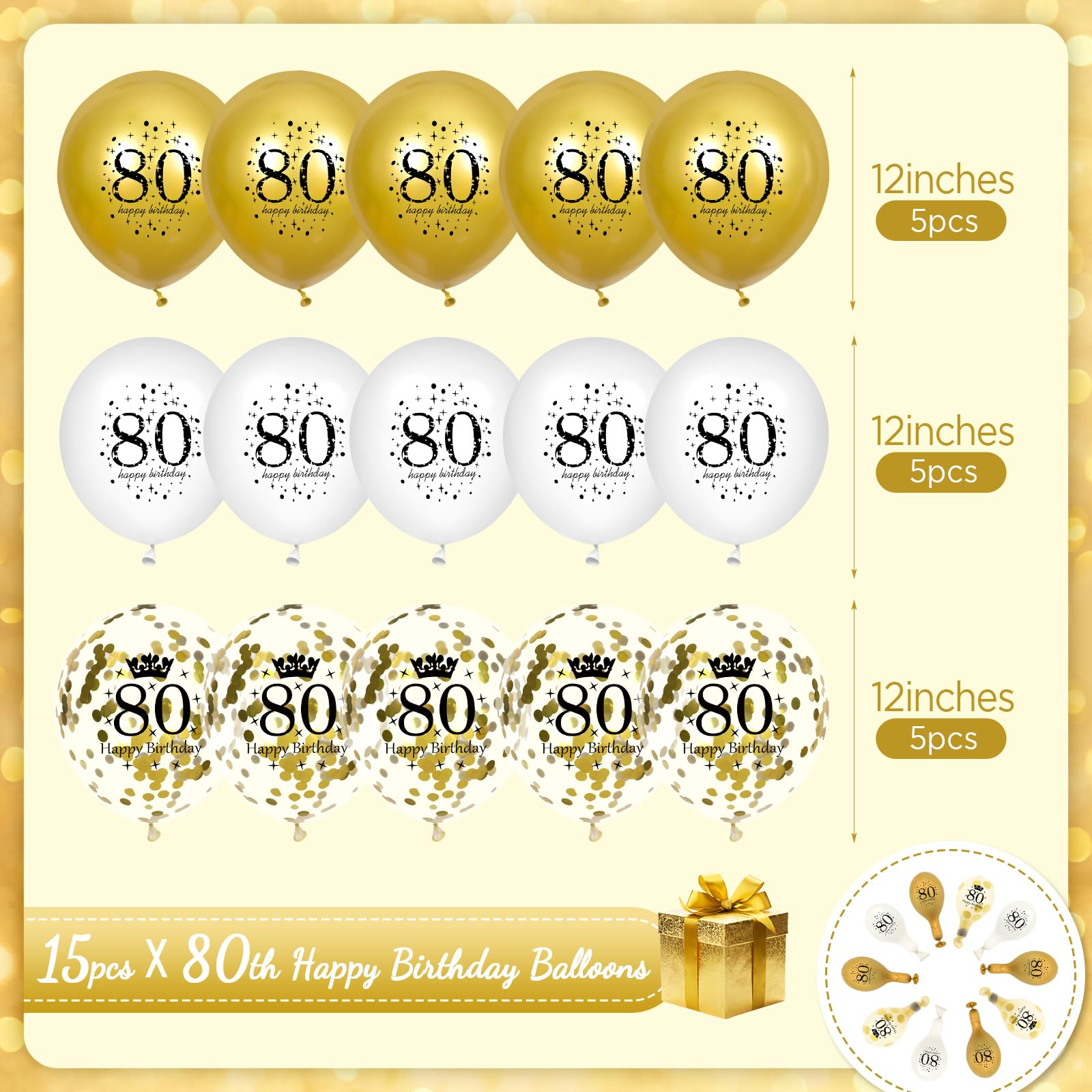 - Q: What is included in the 80th Birthday Balloons pack? A: The 80th Birthday Balloons pack includes a total of 15 pieces of 12-inch balloons. This comprises 5 metallic gold balloons, 5 white balloons, and 5 confetti balloons, making it an ideal choice for both men and women's 80th birthday celebrations.