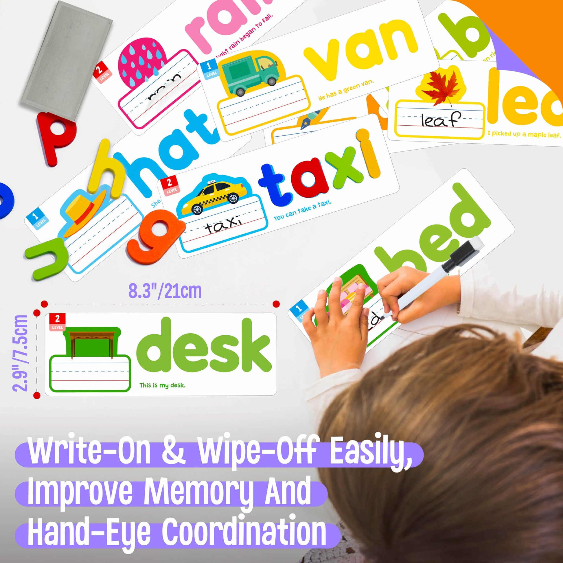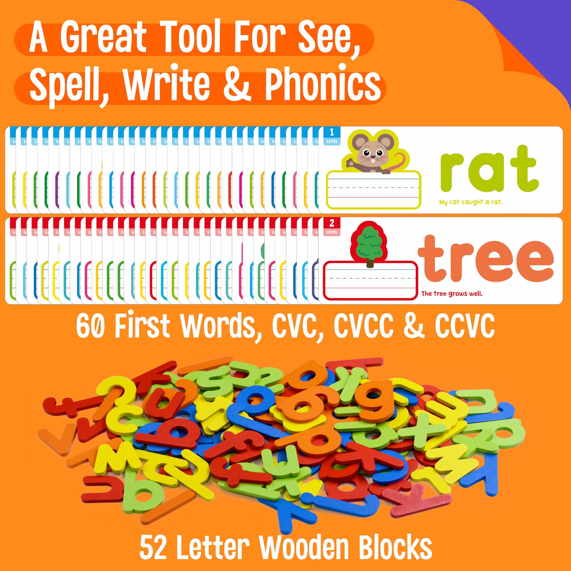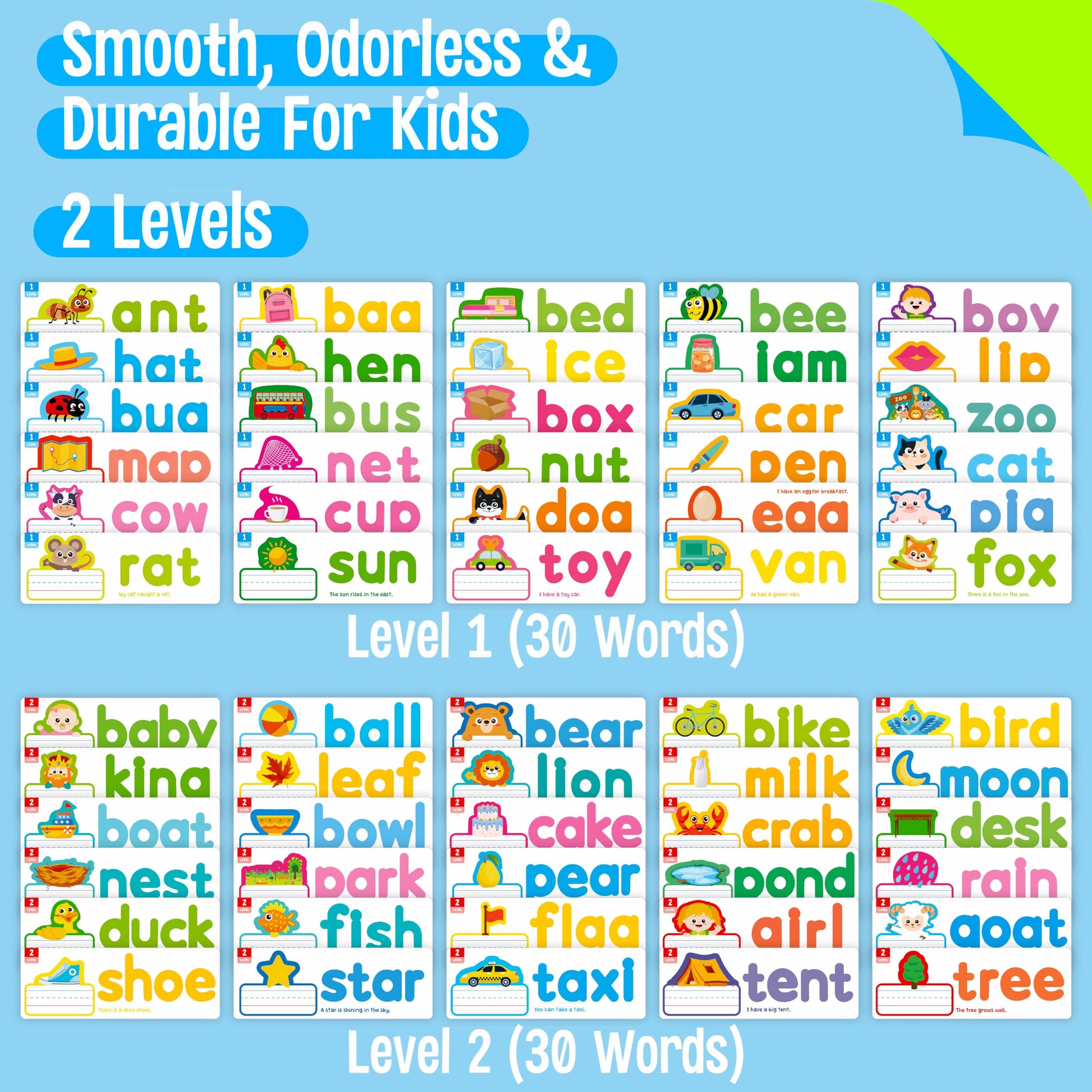 2 Levels: 30 Double-Sided Cards Are Divided Into 2 Different Levels, One Side Is For Cvc Words Learning And Another Side Is For Ccvc Or Cvcc Words Learning. Each Card Has A Clear, Vibrant Image Corresponding To The Word, A Simple Sentence And Enough Writing Space, Which Makes It Easier For Kids To Associate The Object With Its Spelling.