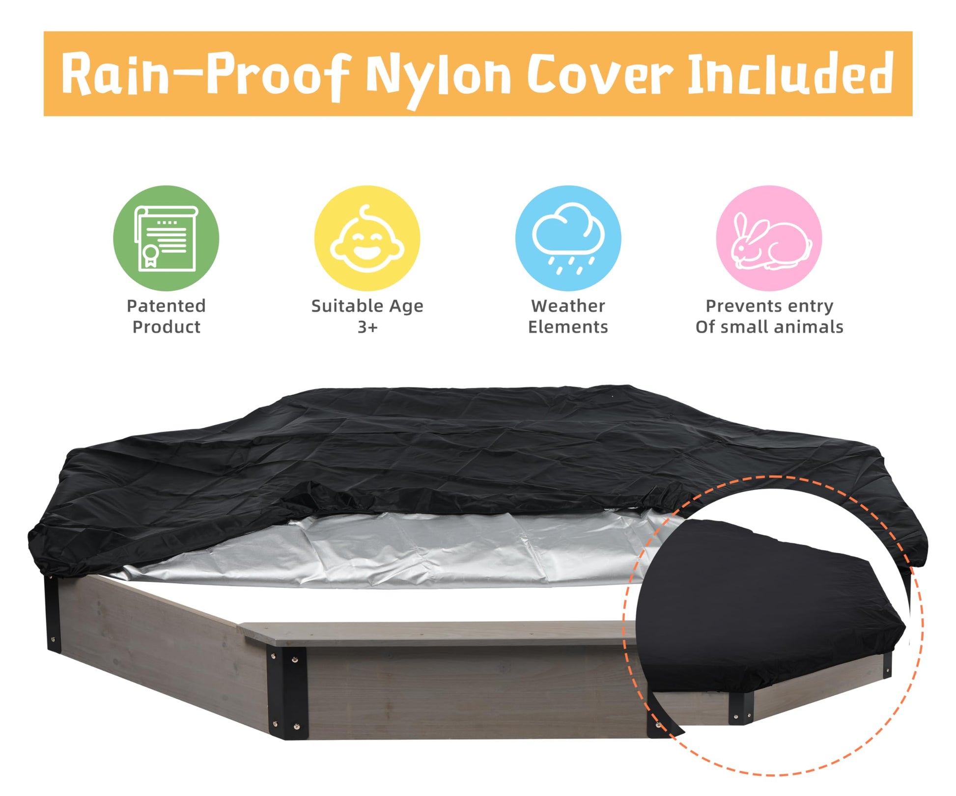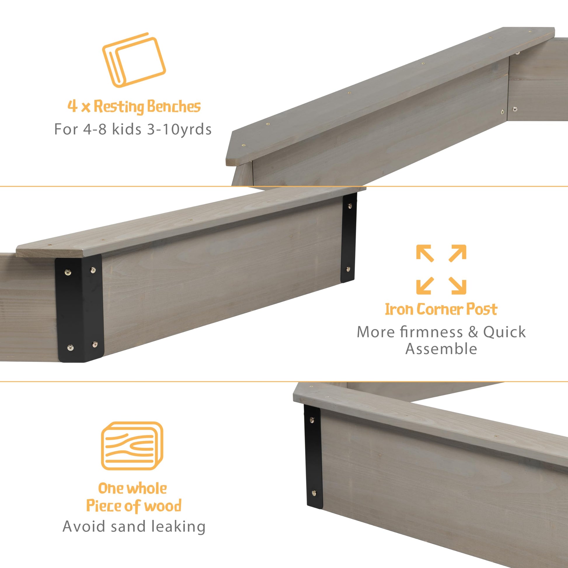 85''x78''x9'' Octagon Sandbox with Cover for Kids Outdoor Play, Wood Large Sandpit with 4 Benches, Quick Easy Install
