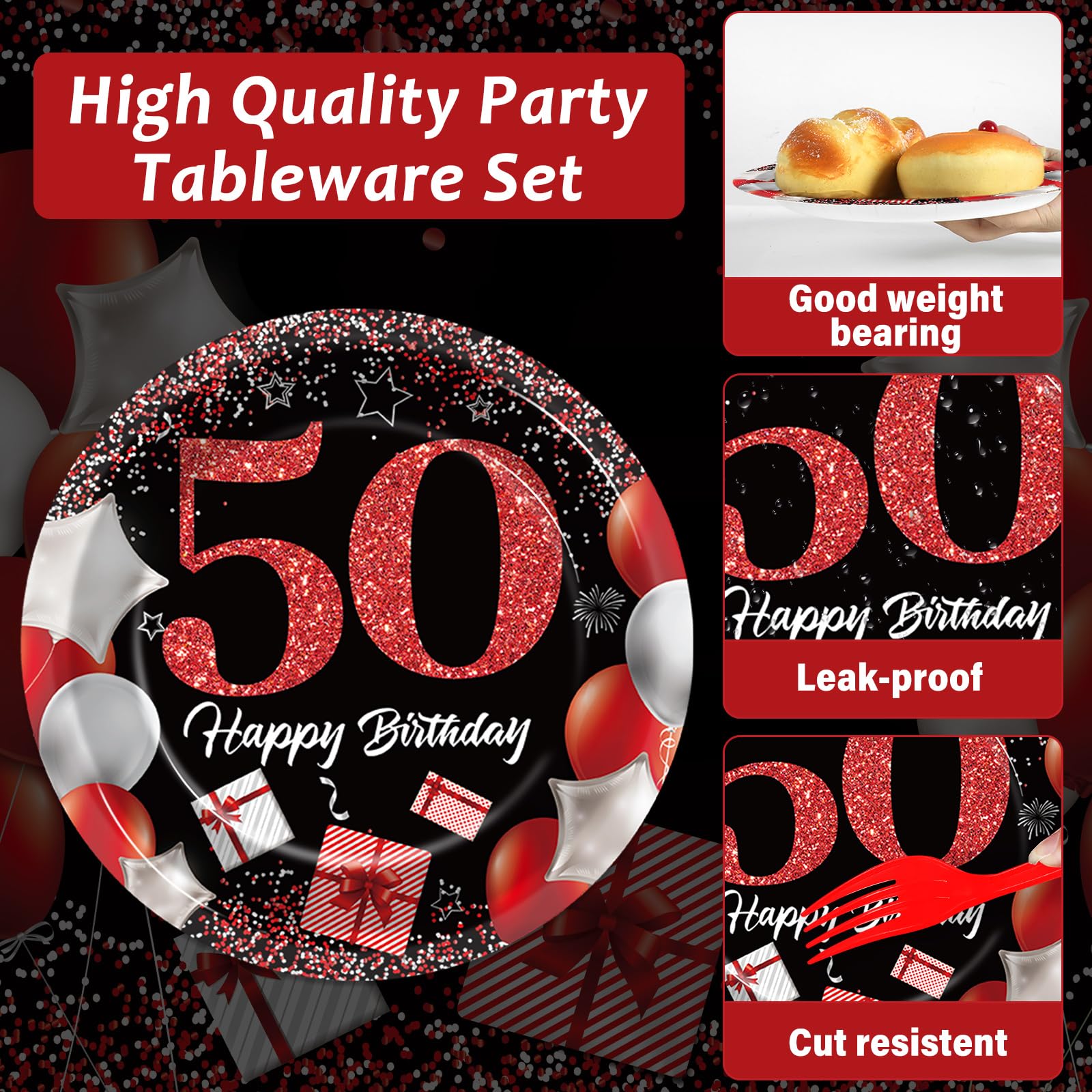 96 Pcs 50th Birthday Party Supplies Paper Plates Napkins 50 Years Old Birthday Party Tableware Red Black Dinner Dessert Plates 50th Birthday Decorations Favors for Man Women Decor Serves 24 What you will get: 24 9 inch dinner plates 24 7 inch dessert plates 24 napkins 24 forks Our 50th birthday party tableware set is sufficient to meet your birthday decorative needs, making your party full of fun and joyful atmosphere. Material: mainly paper 50th birthday party plates napkins party supplies offer you the fastest way to decorate, let you enjoy the birthday party with your friends and family, and leave unforgettable memories!