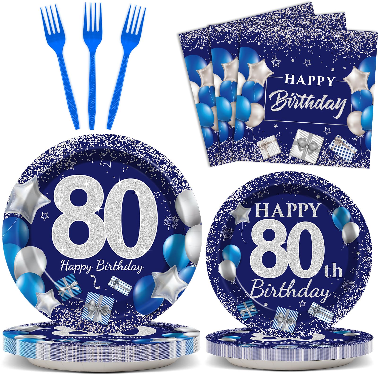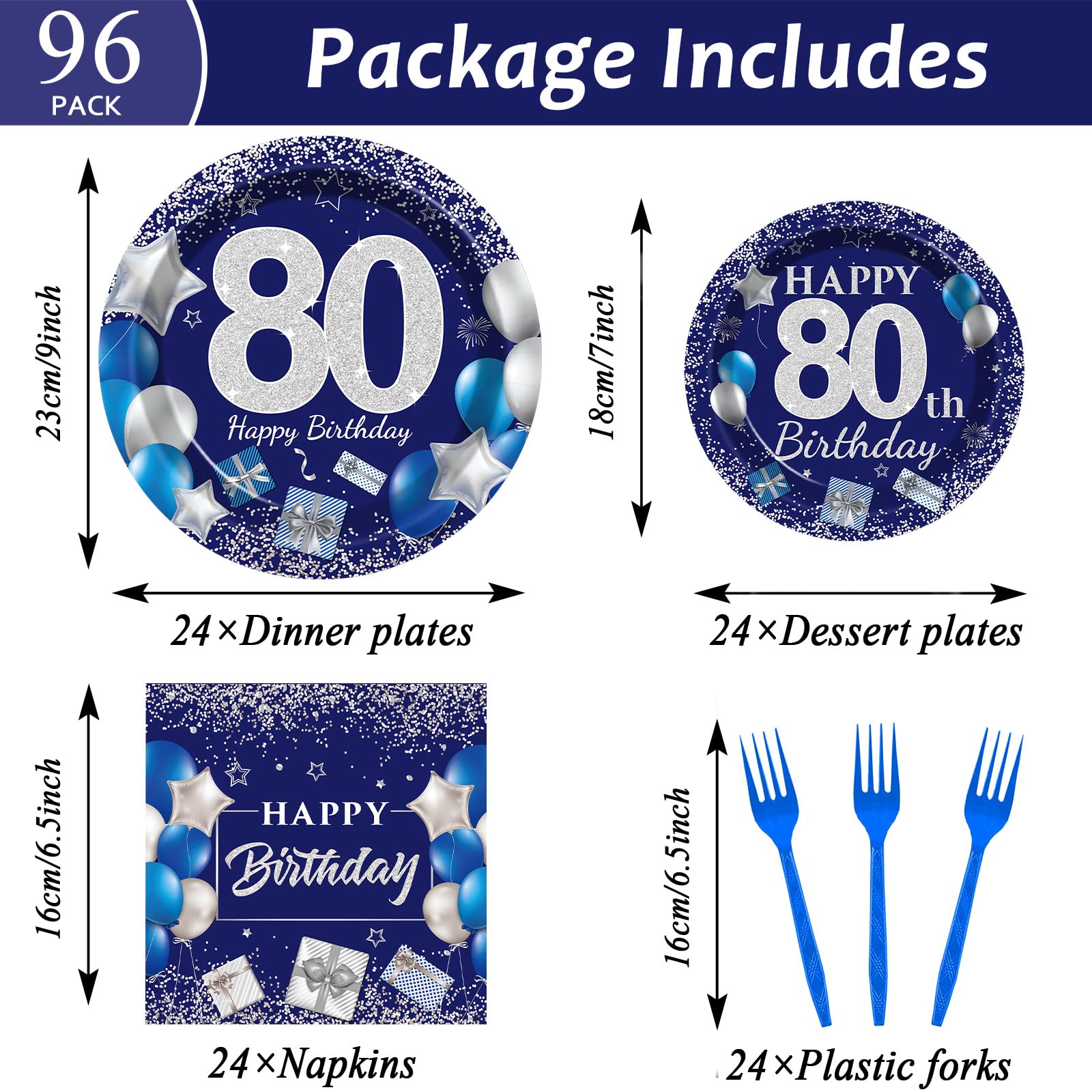 - Q: What items are included in the 80th birthday party supplies set? A: The 96 Pcs 80th Birthday Party Supplies set includes 24 pieces of 9-inch plates, 24 pieces of 7-inch plates, 24 pieces of 6.5-inch navy blue and silver birthday napkins, and 24 plastic blue forks, making it perfect for serving 24 guests.