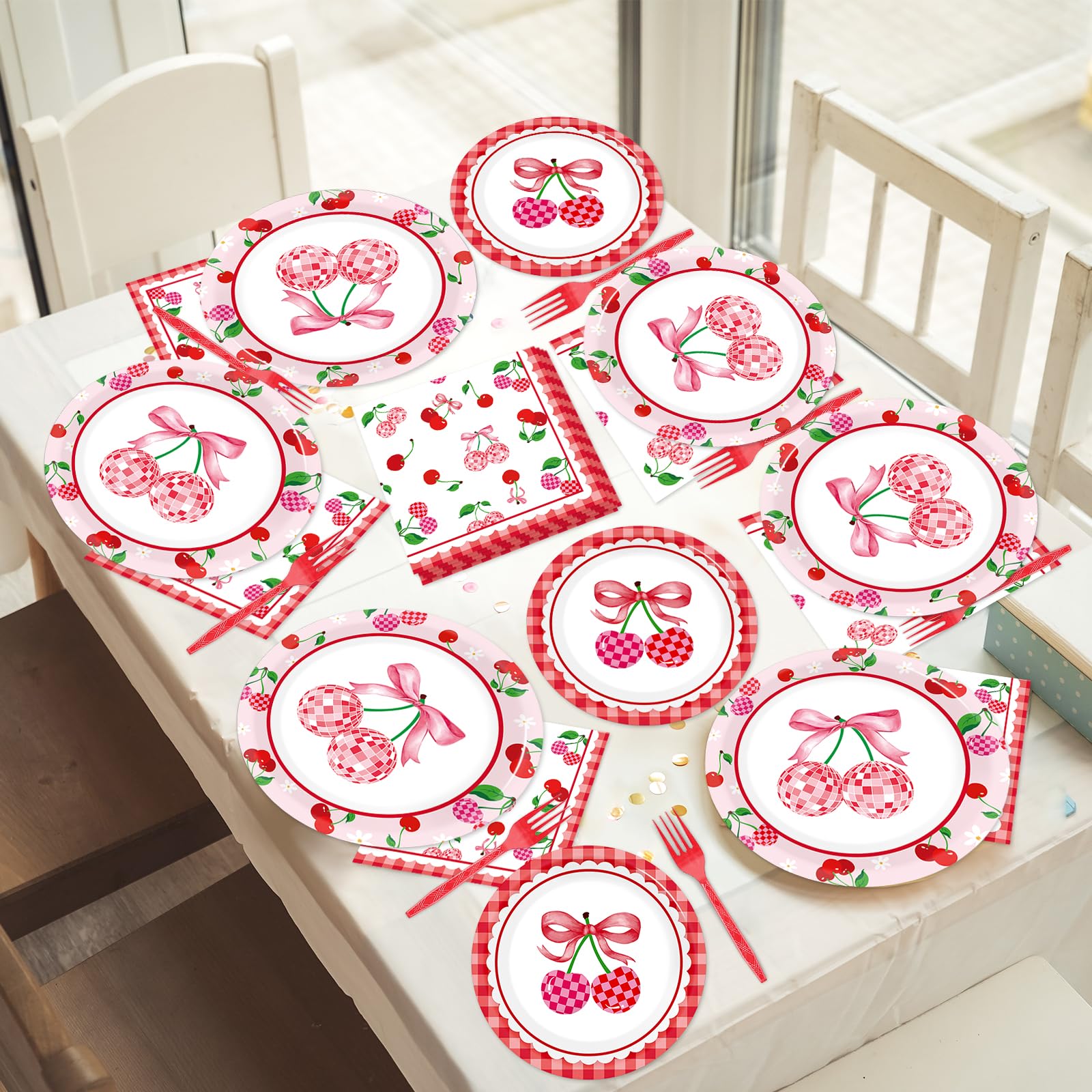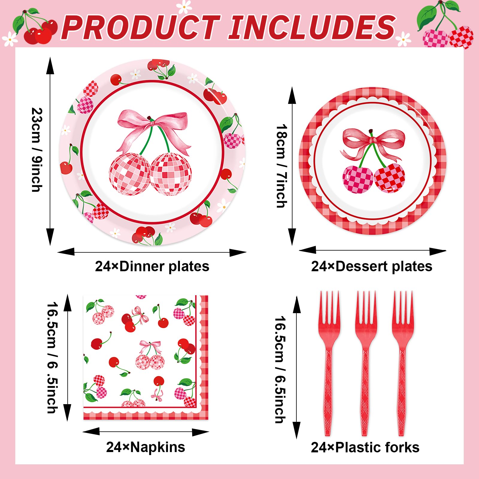 96PCS Cherries Disco Ball Plates and Napkins for Cherry Party Decorations Pink Bow Cherries Disco Ball Themed Disposable Dessert Paper Plates for Wedding Bridal Baby Shower Birthday Party Supplies Specifications: Material:paper plastic Color: colourful Package contains: 24 x 7-inch Cherry Party Plates and Napkins 24 x 9-inch Cherry Party Plates and Napkins 24 x 6.3-inch Cherry Party Plates and Napkins 24Pcs of forks Spice up you Cherry Birthday Party with our Disposable Cherry Party Plates and Napkins. These Cherry Party Plates and Napkins decorations will give your guests unforgettable memories.