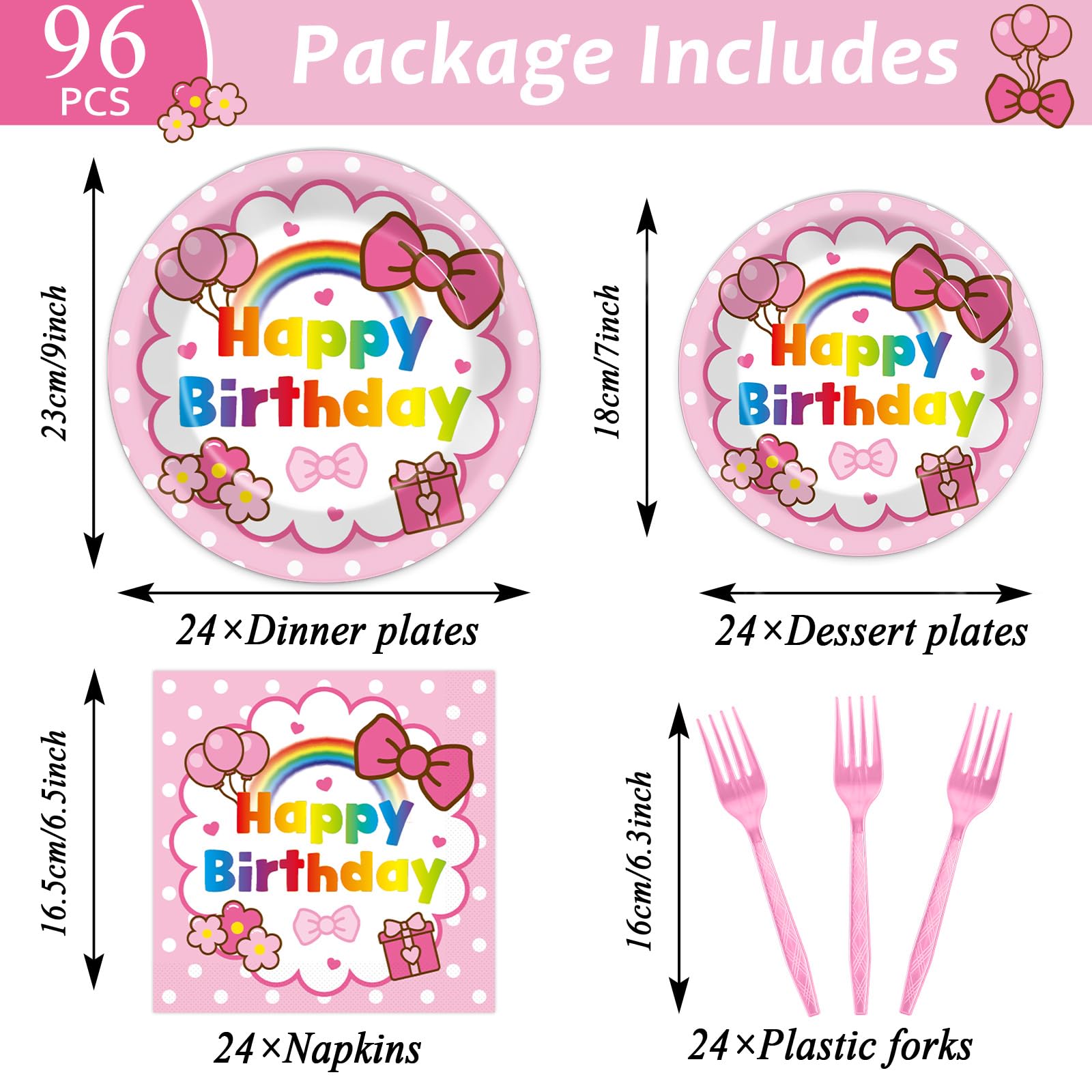 96Pcs Pink Cat Birthday Party Supplies Cartoon Cute Cat Paper Plates and Napkins Pink Bow Rainbow Disposable Tableware Set for B