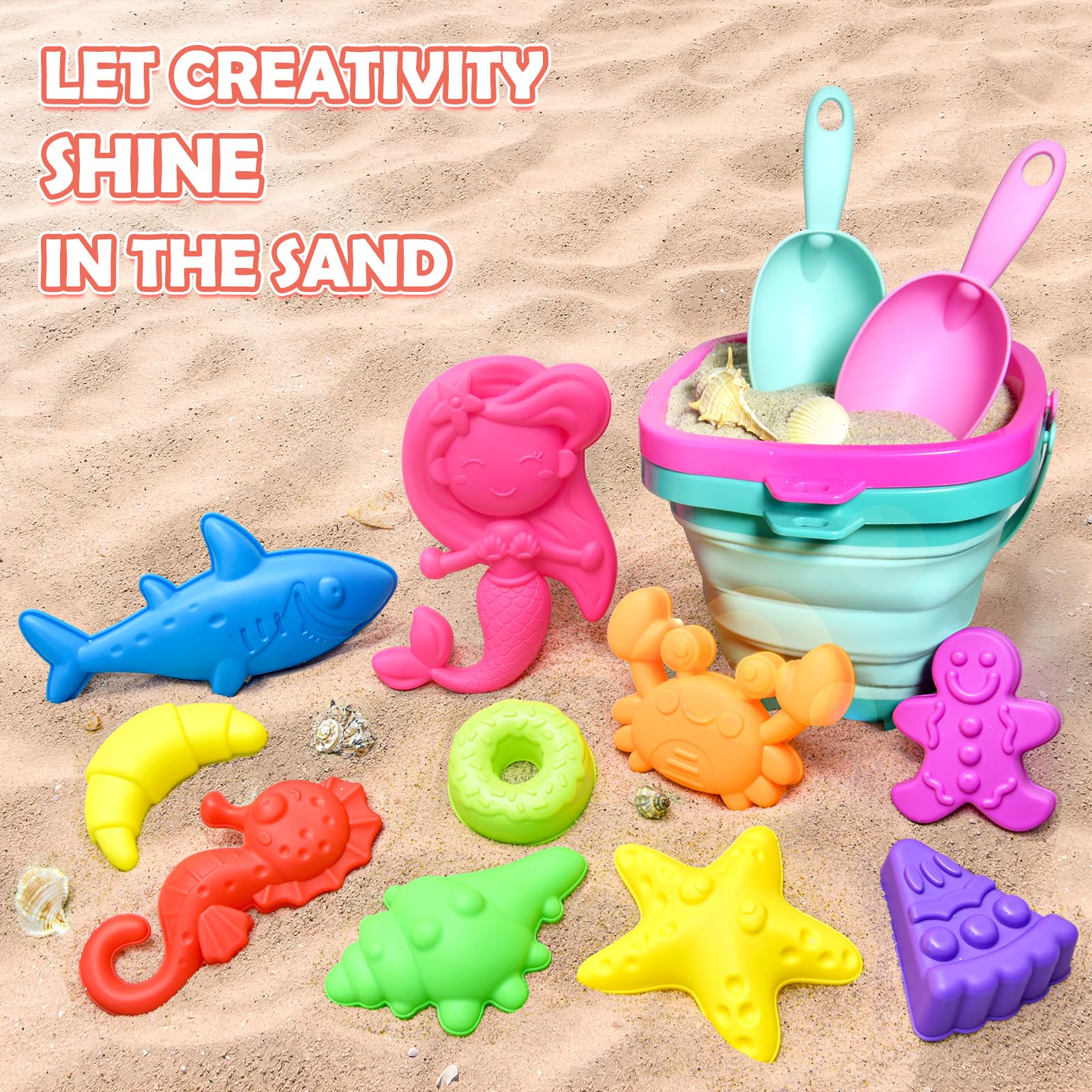 Aclarastra Collapsible Beach Sand Toys with 2 Buckets, 2 Shovels, 10 Molds