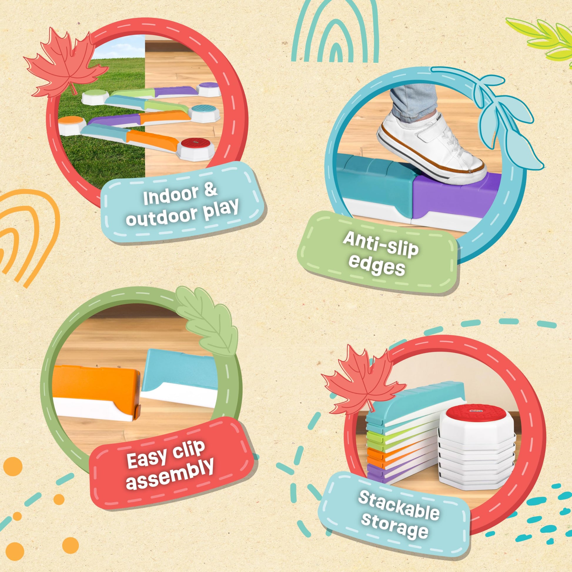 - Q: Can the balance beam and stepping stones be used outdoors? A: Yes, the Acorn Avenue Balance Beam and stepping stones are made from durable, non-slip plastic, making them suitable for both indoor and outdoor play.