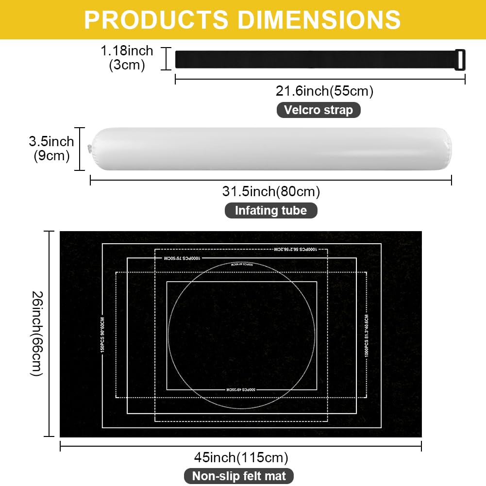 Ainiv enhanced Felt Puzzle Mat well-made puzzle mat stores unfinished puzzles safely and correctly. You can use this puzzle mat to safely store your puzzles by placing your puzzle pieces on the included mat and then rolling them inside the puzzle mat for a sestorage solution. Simply spread out and flatten the felt pad onto a smooth flat surface to start your puzzle game. If you want to pause and safely store your unfinished puzzle for next time place the inflatable tube on each end of the mat roll up the mat with even pressure and sethe ends with rubber bands. This puzzle mat is completely portable so you can take it with you wherever you go making it a great gift for puzzle lovers. Product specifications: Name: Puzzle Storage Blanket Set Material: felt color: black Size: 45