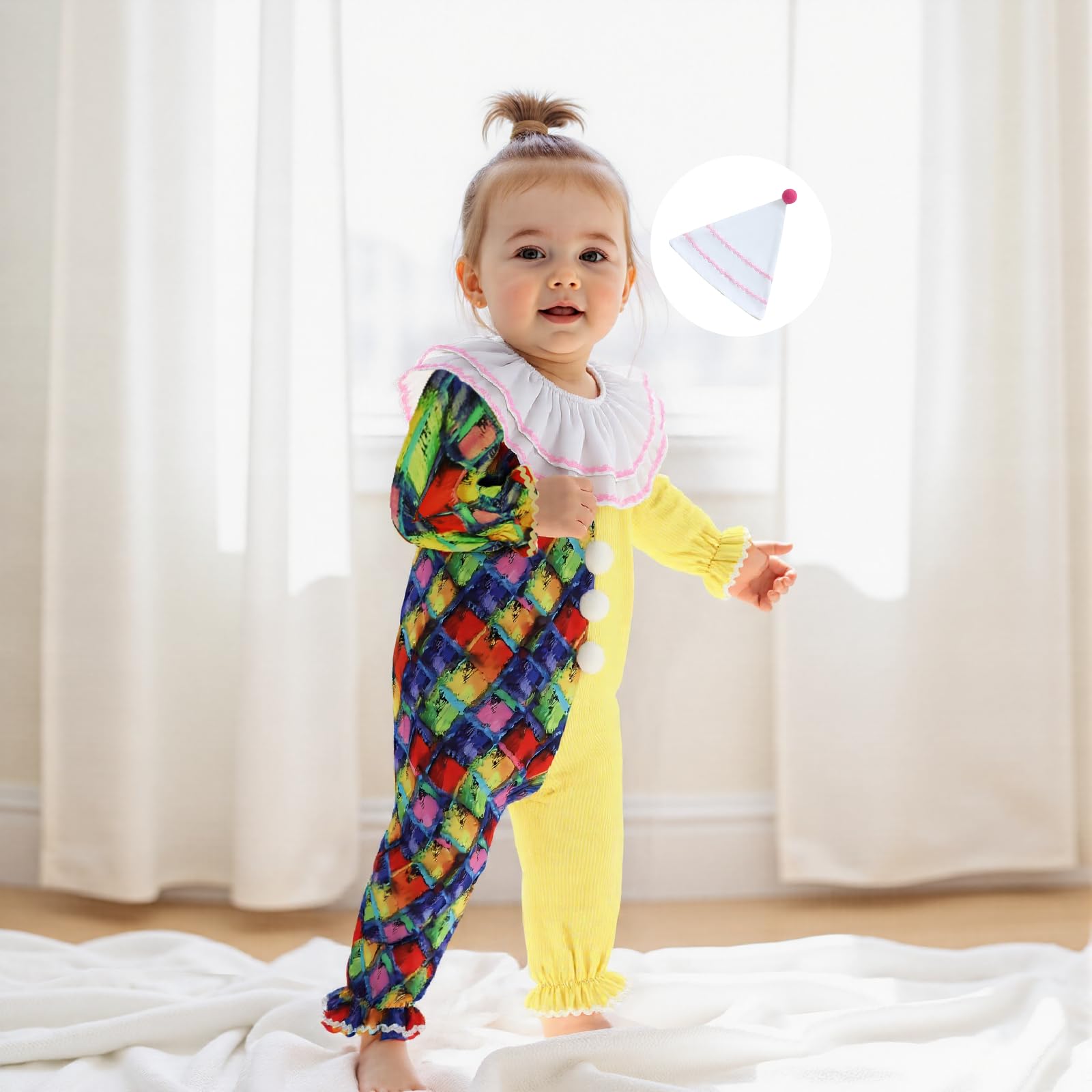 Aiwpstoin Toddler Baby Clown Costume Boy Girl Funny Halloween Outfit Contrast Color Long Sleeve Jumpsuit with Hat (Yellow, 18-24