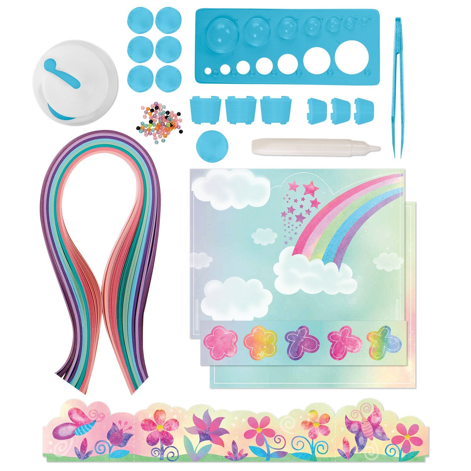 ALEX DIY PAPER SWIRLS Unicorn Fantasy introduces young craft enthusiasts to the world of quilling; making art with rolled paper strips. Make an adorable unicorn diorama with 130 colorful, fringe, foil and glitter strips of paper. Create 3 unicorns, flowers and more. The Swirly Gig makes quilling easy by rolling the strips into perfect spirals, with the push of a lever. The instruction booklet teaches you how to make lots of suggested shapes and to swirl around body forms to make bigger creations. The creative possibilities are endless. Includes a Swirly Gig Easy Quilling Tool, 100 Self-Adhesive Paper Strips (0.28in/7mm wide), Quilling Board, 13 Body Forms, Tweezers, 20 Beads, 5 Punch-Outs, 3-Part Cardboard Stage, White Glue (0.3oz/9ml), 30 Fringe/Foil/Glitter Strips and an Easy Instruction Booklet. Recommended for children 8 years of age and older.
