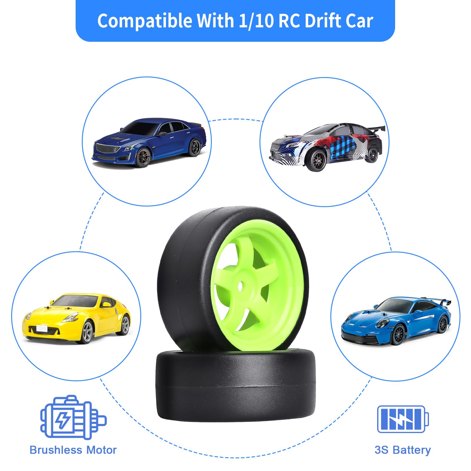 - Q: What is included in the package of AllinRC Drift Tires and Wheels? A: The package includes a set of 4 AllinRC Slick Drift Tires and Wheels, which come with locknuts for secure fitting on your RC car.