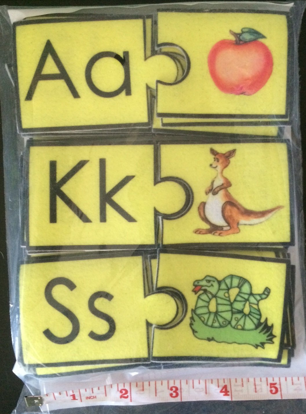 Children match the upper/lower-case letters to the picture that begins with that letter. There is no cheating because all the letters sides of the puzzle fit to all the picture sides. This will help to know if your child really understands his sounds. Can be used on a table top or on a flannel board.
