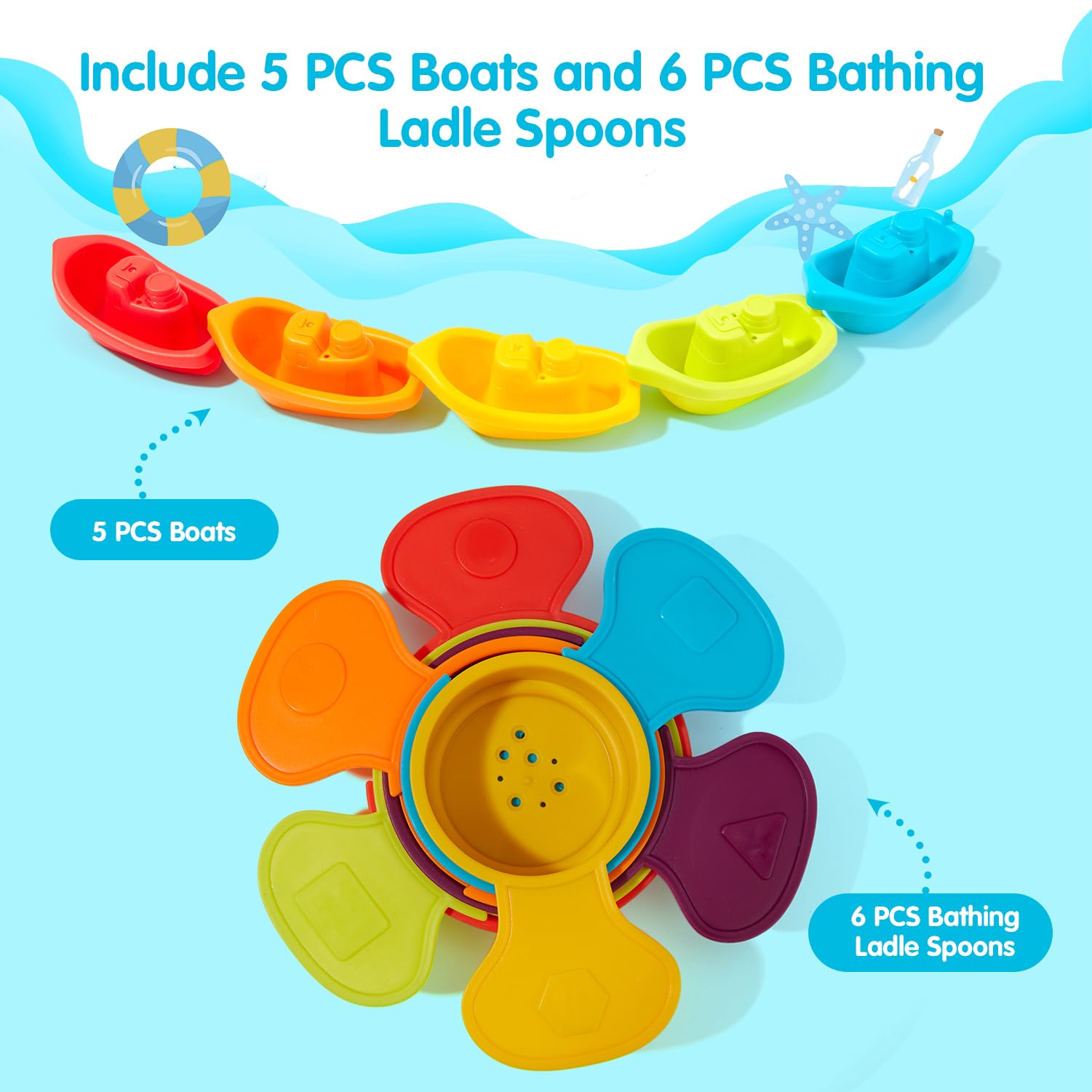 Baby Bath Toy Set: Product Inlcude 5 Pcs Plastic Boats And 6 Pcs Plastic Bathing Ladle Spoons.Kids Will Like Bathing With Them.Children Can Also Use Them To Play With Sand On The Beach. Safe And Quality:Made Of Safe Materials.Fine Fabrication Without Edges And Corners.Toddlers Can Play At Ease. Present For Boys And Girls:Popular Bathtub/Ocean/Swimming Pool Toy For 6 Months-3 Years Old Toddlers.No Child Will Refuse Water Toys.Good Ideal For Christmas Day/Birthday/Children'S Day/Kids Party. Early Education Pool Toys Preschool:Unique And Colorful Design Helps Baby To Recognize The Color And Improve Their Hand-Eye Coordination And Imaginative. Have Fun And Learning:Stack, Scoop, Strain, Spill, Pour & More - Amchsuri Bath Toy Will Keep Curious Minds Occupied & Entertained All Bath Long.