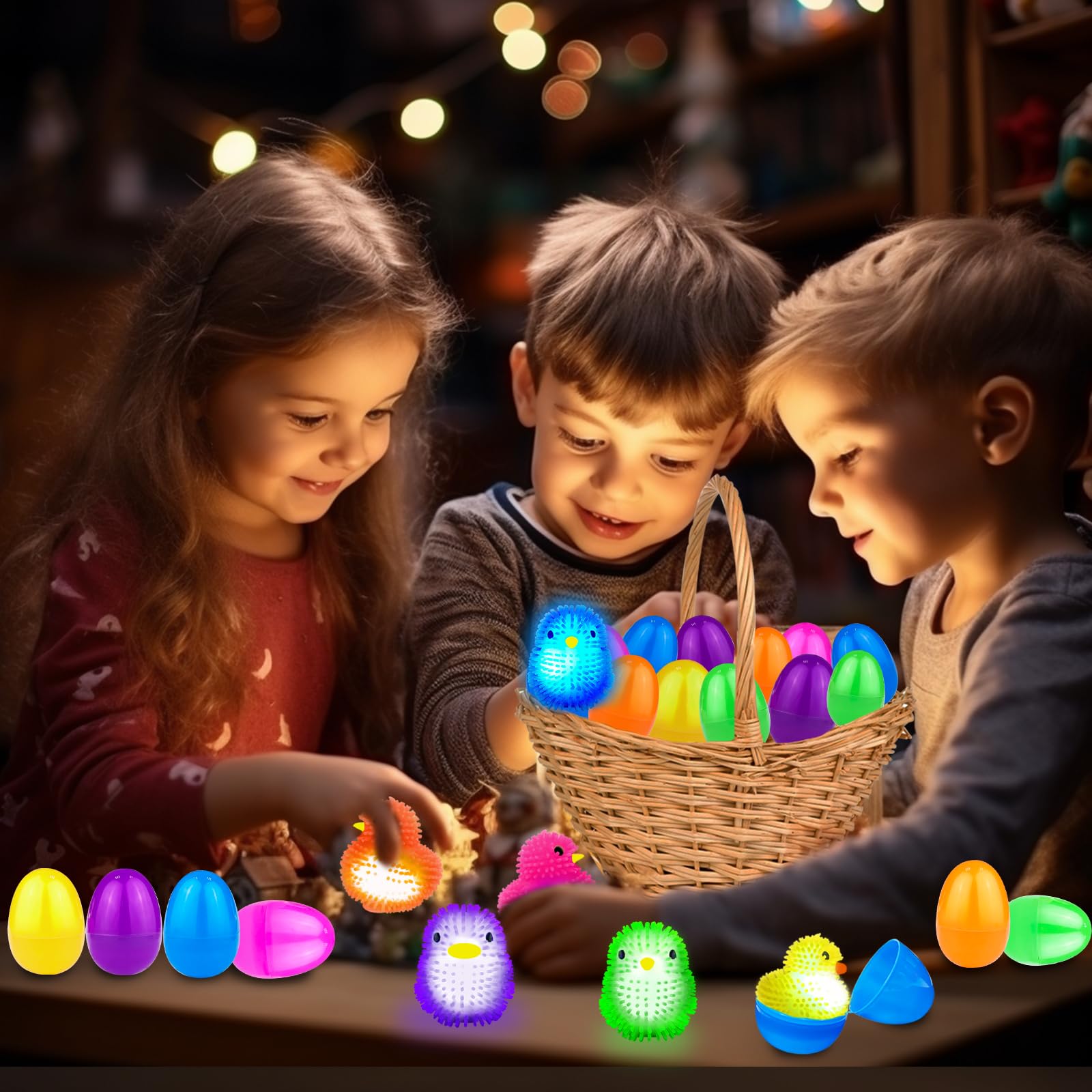 AMENON 24 Pack Easter Basket Stuffers Chick Duck LED Puffer Balls Easter Eggs Filled Light Up Squeeze Sensory Ball Stress Relief