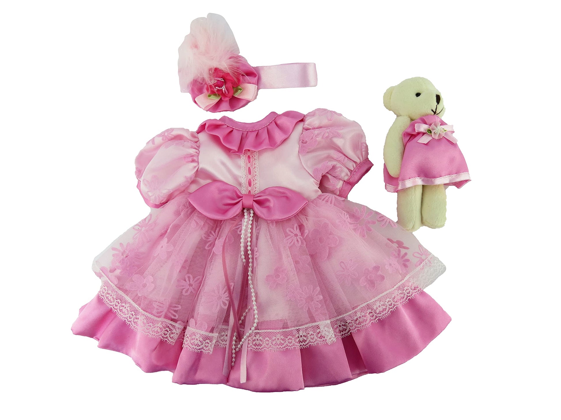 American Fashion World Pink Flower Dress 3 Piece Set for 18-Inch Dolls | Bear and Headband Included | enhanced Quality & Trendy Design | Dolls Clothes | Outfit Fashions for Dolls for Popular Brands