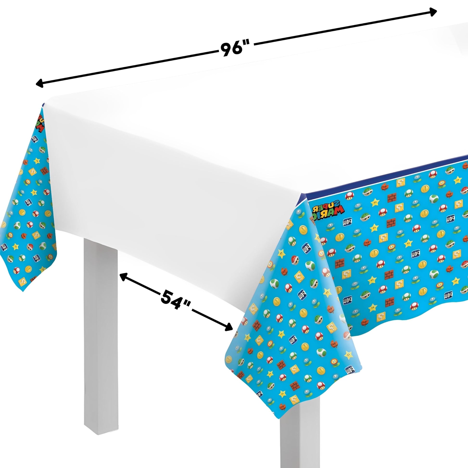 Any Super Mario superfan will love this colorful table cover featuring all their favorite characters - Mario, Luigi, Wario, Waluigi, Donkey Kong, Princess Peach, Daisy, Bowser, Yoshi, Boo and many more! The disposable plastic table cover measures 54 in. x 96 in., fits most tables and provides both decoration and furniture protection. Youll love the quick and easy cleanup when the adventure gets messy! Its sure to pack a punch when coordinated with other Super Mario-themed birthday party supplies!