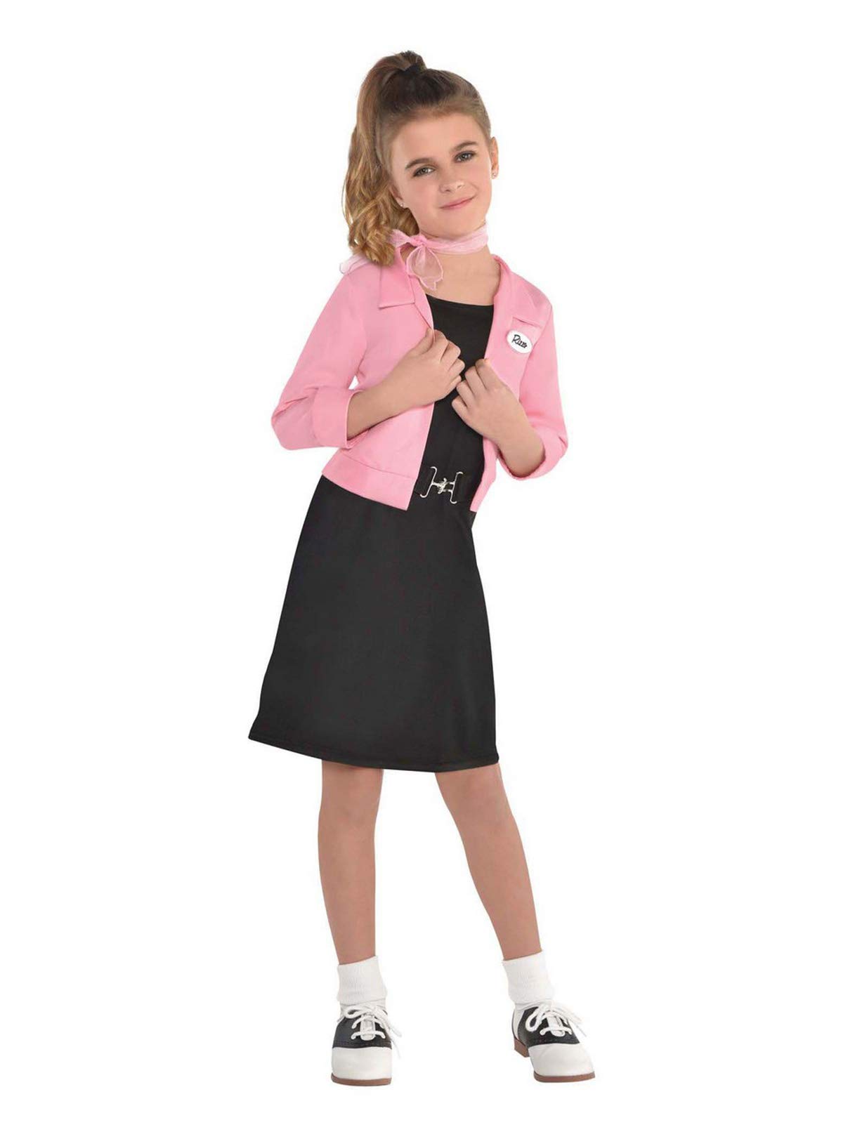 This fun kids Grease Pink Ladies costume includes a dress with attached jacket, scarf and 4 switchable name tags.