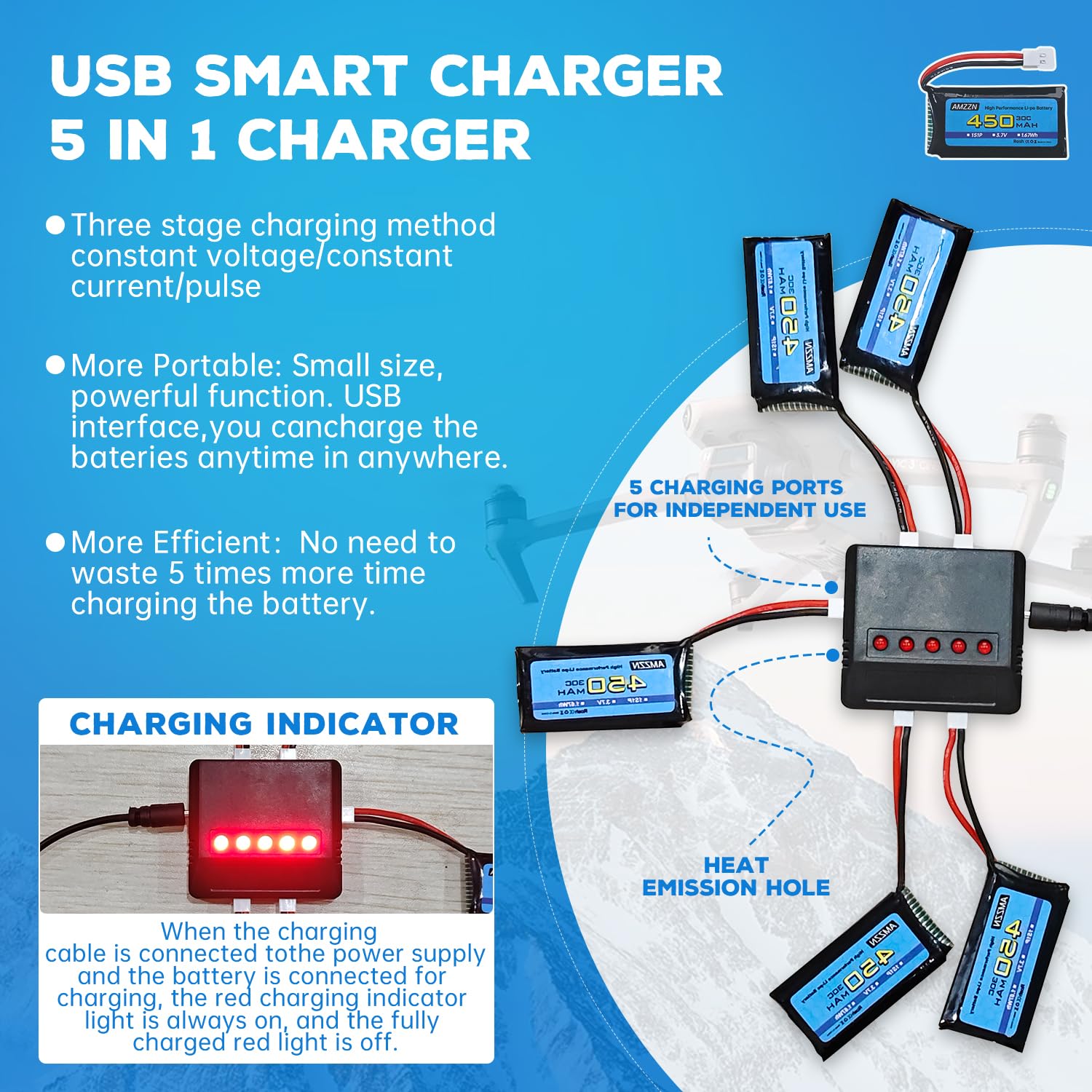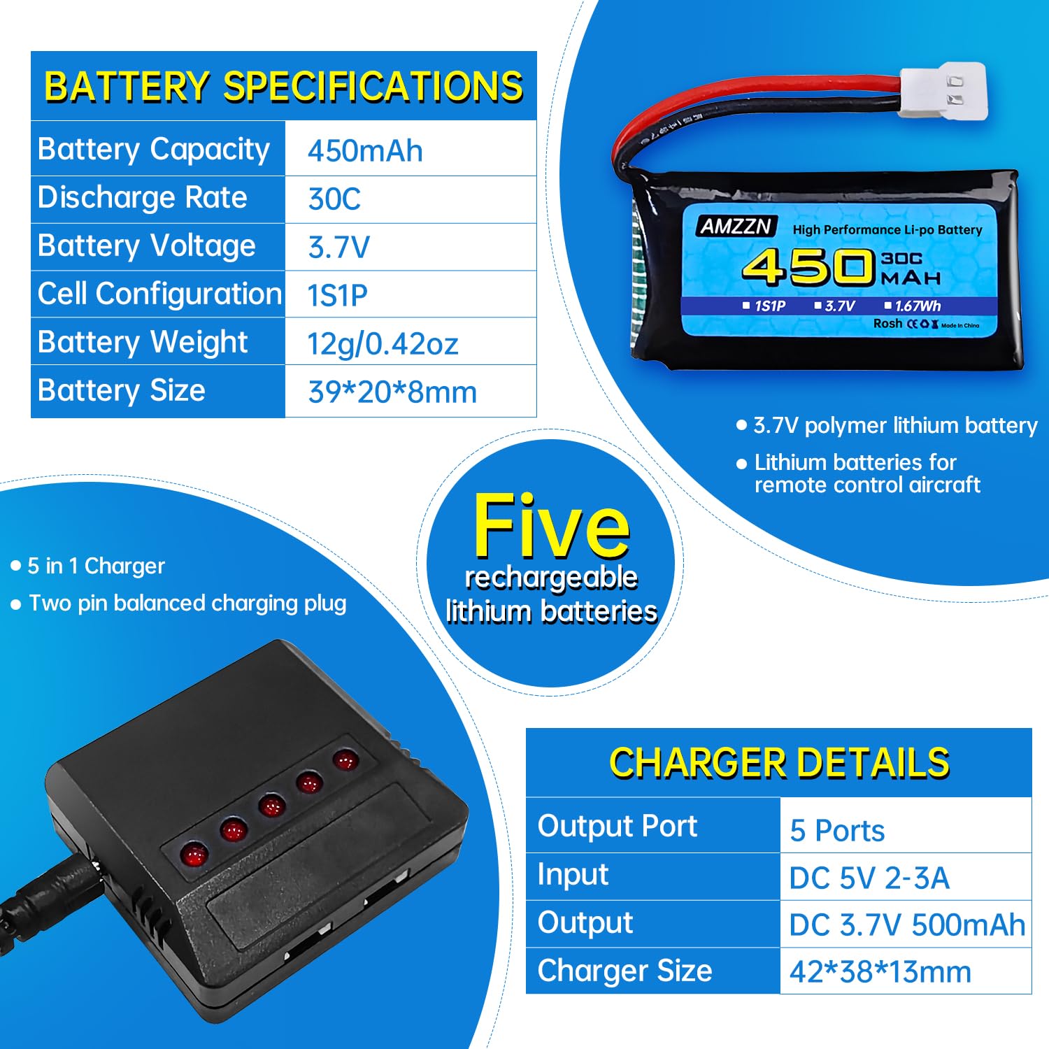 Amzzn 5Pcs 3.7V 450Mah 30C Lipo Battery With 5-In-1 Charger Molex Plug Compatible With Most Rc Drones, Four Axis Aircraft And Sy