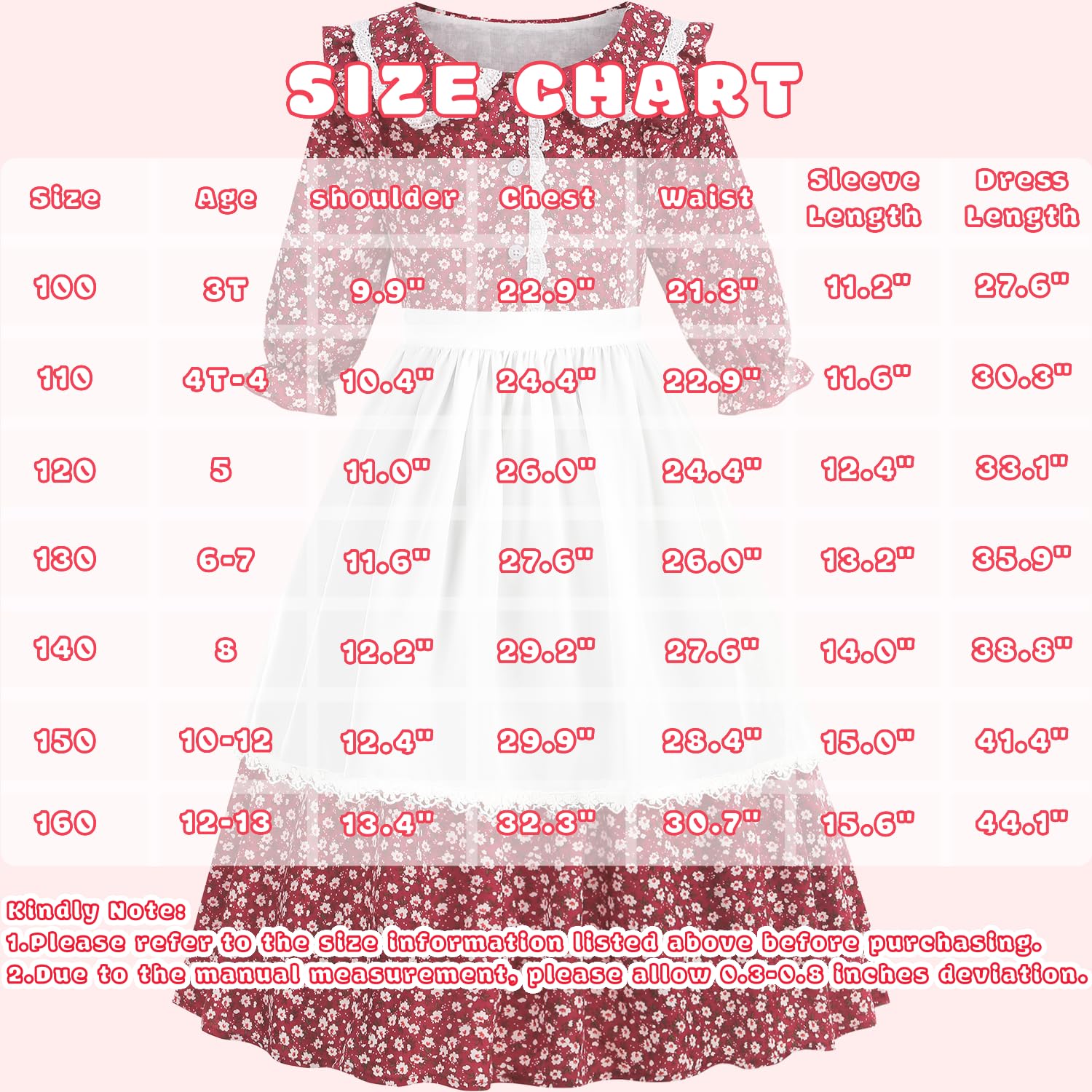 Aoiviss Girls Pioneer Costume Floral Colonial Prairie Dress for Little Kids with Apron and Bonnet Size Information: 3T/100: Shoulder 9.9 , Chest 22.9 , Waist 21.3, Sleeve Length 11.2'', Dress Length 27.6 4T-4/110: Shoulder 10.4 , Chest 24.4 , Waist 22.9, Sleeve Length 11.6'', Dress Length 30.3 5/120: Shoulder 11 , Chest 26 , Waist 24.4, Sleeve Length 12.4'', Dress Length 33.1 6-7/130: Shoulder 11.6 , Chest 27.6 , Waist 26, Sleeve Length 13.2'', Dress Length 35.9 8/140: Shoulder 12.2 , Chest 29.2 , Waist 27.6, Sleeve Length 14'', Dress Length 38.8 10-12/150: Shoulder 12.4 , Chest 29.9 , Waist 28.4, Sleeve Length 15'', Dress Length 41.4 12-14/160: Shoulder 13.4 , Chest 32.3 , Waist 30.7, Sleeve Length 15.6'', Dress Length 44.1 Kindly Note: 1.Please refer to the size information listed in the size chart before purchasing. 2.If you have any questions, please feel free to contact us, we will give you a satisfactory solution within 24 hours. Washing Instructions: Recommended to wash by hand Wash carefully in cold water Do not bleach machine wash cold gently