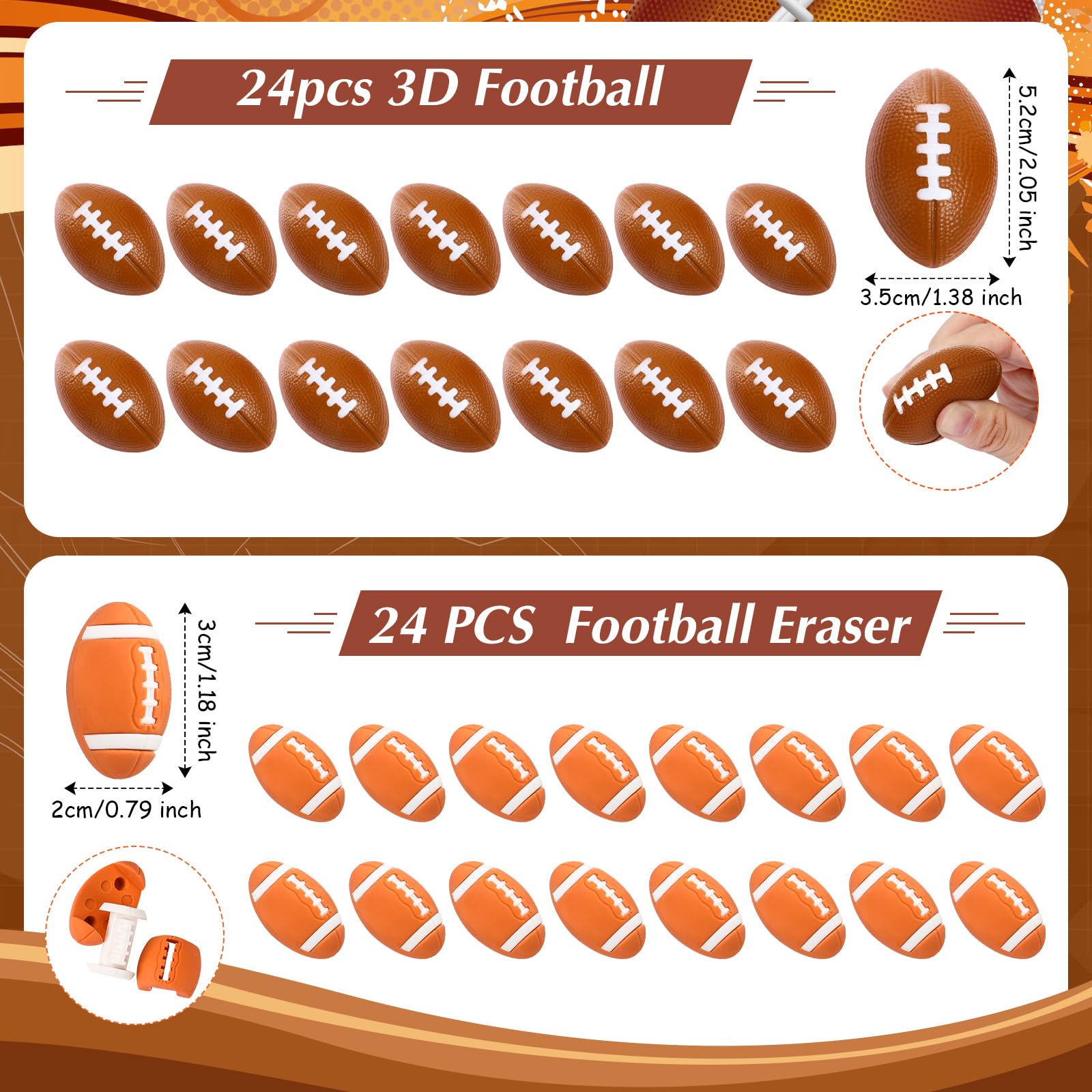 Features: Delicate gifts: You can send the football theme party favors to your guests who participate your parties or activities, and you can also send them as the gifts to football team, which is meaningful and will show your love to them directly Practical and Useful: The football theme gift is the combination of appearance and practicability, you can use the erasers in the package when you work or study, you can wear the bracelet to match your costume, or you can hang your keys on the keychain to delight your day. Specifications: Material: Mini bouncy football: PU Silicone bracelets: silicone Keychains: PVC Color: as the picture shows Size: Silicone bracelets: about 7.48 x 0.47 x 0.08 inches/ 190 x 12 x 2 mm Keychains: about 0.98 inches/ 2.5 cm Non woven gift bags: about 9.84 x 15.75 inches/ 25 x 40 cm Mini bouncy football: about 2.05 x 1.38 inches/ 5.2 x 3.5 cm Erasers: about 1.02 inches/ 2.6 cm in diameter Package includes: 24 x Football silicone bracelets 24 x Football charm bracelets 24 x Mini bouncy football 24 x Football keychains 24 x Football non woven gift bags 50 x Football stickers 24 x Football erasers Notes: Manual measurement, please allow slight errors on size. The color may exist a slight difference due to different screen displays.