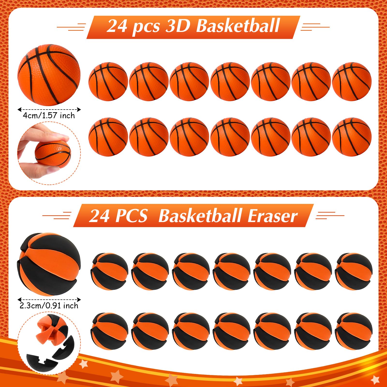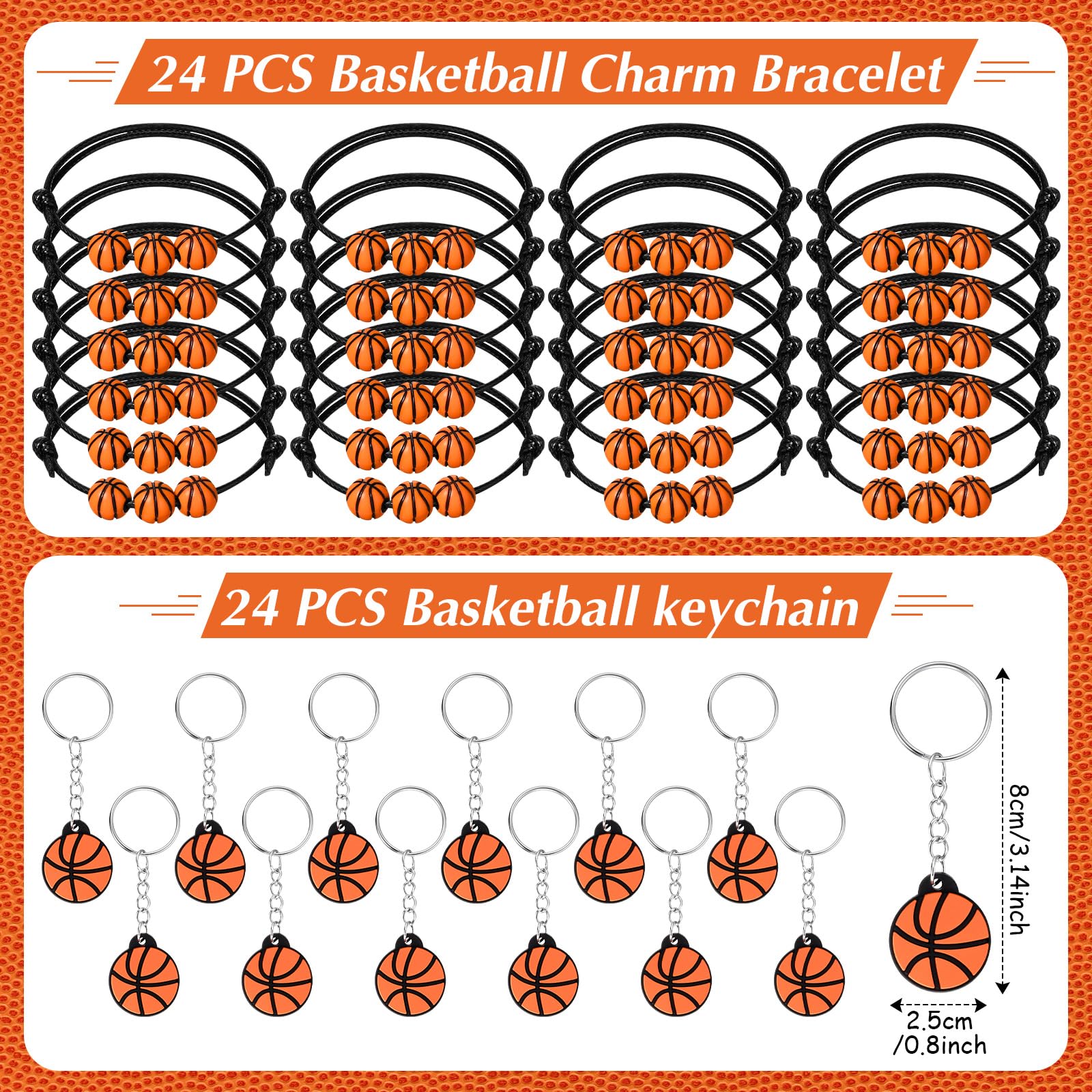 Features: Delicate gifts: You can send the basketball theme party favors to your guests who participate your parties or activities, and you can also send them as the gifts to basketball team, which is meaningful and will show your love to them directly Practical and Useful: The basketball theme gift is the combination of appearance and practicability, you can use the erasers in the package when you work or study, you can wear the bracelet to match your costume, or you can hang your keys on the keychain to delight your day. Specifications: Material: Mini bouncy basketball: PU Silicone bracelets: silicone Keychains: PVC Color: as the picture shows Size: Silicone bracelets: about 7.48 x 0.47 x 0.08 inches/ 190 x 12 x 2 mm Keychains: about 0.98 inches/ 2.5 cm Non woven gift bags: about 9.84 x 9.84 inches/ 25 x 25 cm Mini bouncy basketball: about 1.57 inches/ 4 cm in diameter Erasers: about 1.02 inches/ 2.6 cm in diameter Package includes: 24 x basketball silicone bracelets 24 x basketball charm bracelets 24 x Mini bouncy basketball 24 x basketball keychains 24 x basketball non woven gift bags 50 x basketball stickers 24 x basketball erasers Notes: Manual measurement, please allow slight errors on size. The color may exist a slight difference due to different screen displays.