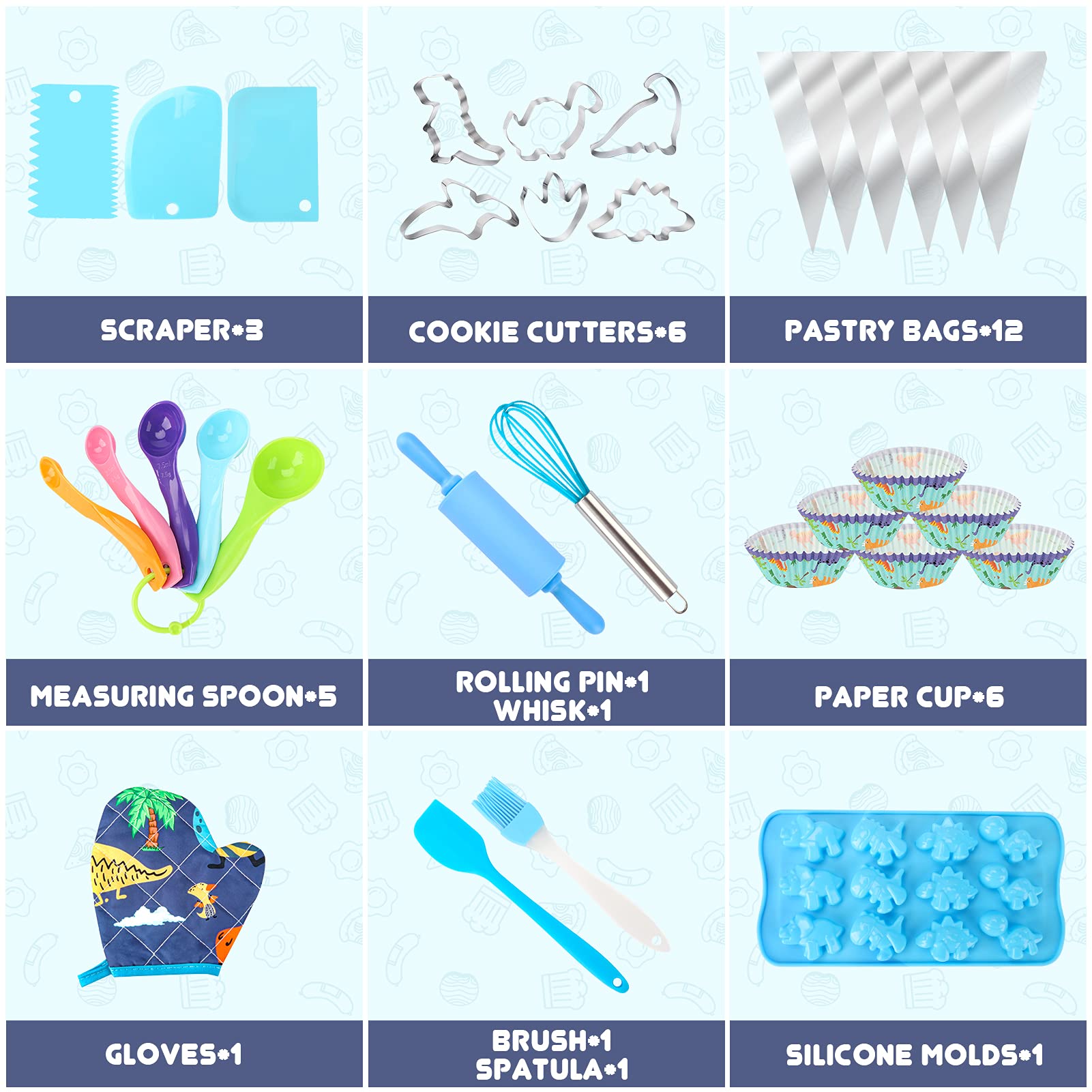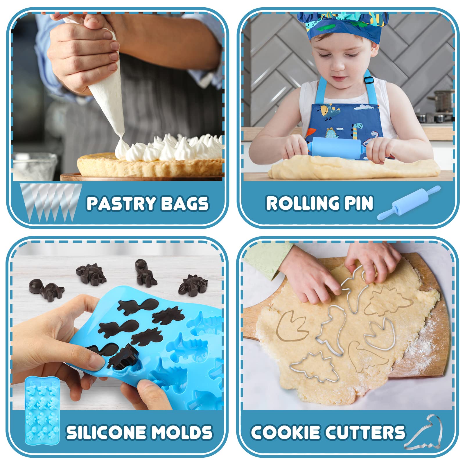 - Q: What items are included in the Aoskie Kids Baking Set? A: The set includes a dinosaur-themed apron, chef hat, 6 cookie cutters, 12 pastry bags, 1 silicone mold, and various other baking supplies, providing everything needed for a fun baking experience.