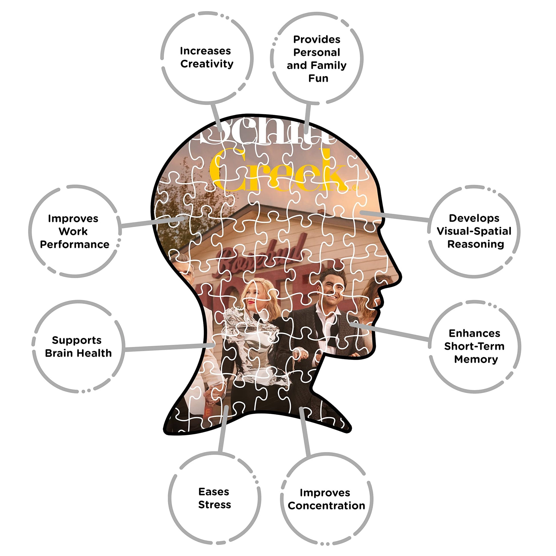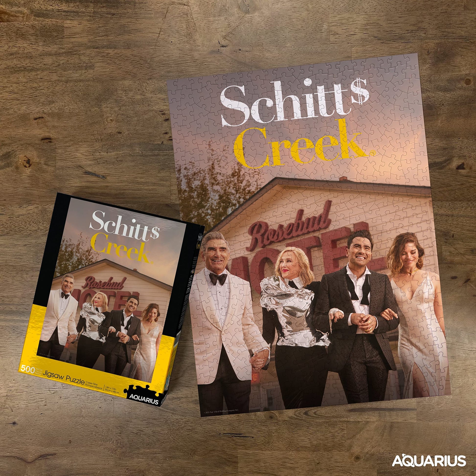 Have fun putting together this 500 piece puzzle featuring everyones favorite family, the Roses’. Welcome to Schitt’s Creek, where everyone fits in