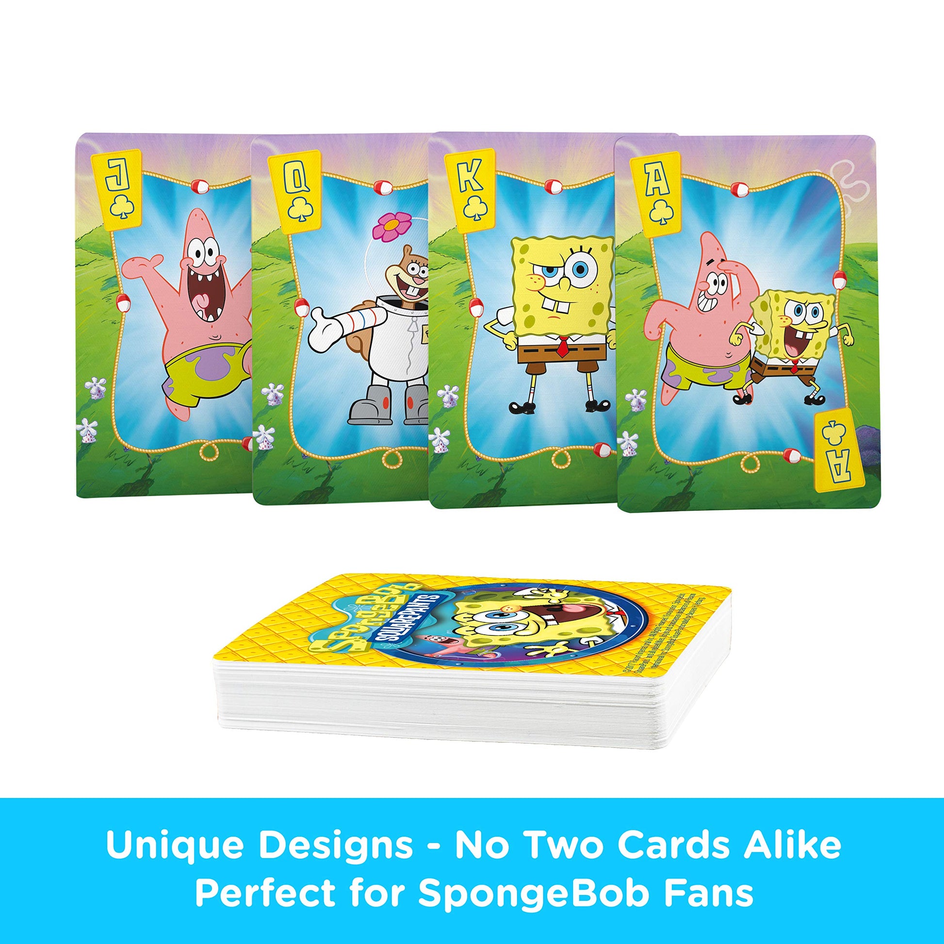 • Q: What makes the AQUARIUS SpongeBob Playing Cards unique? A: The AQUARIUS SpongeBob Playing Cards feature a unique design on every card, with 54 distinct SpongeBob themed designs, including 52 playing cards and 2 jokers. This variety ensures that no two cards are alike, making them a fun addition to any game night.
