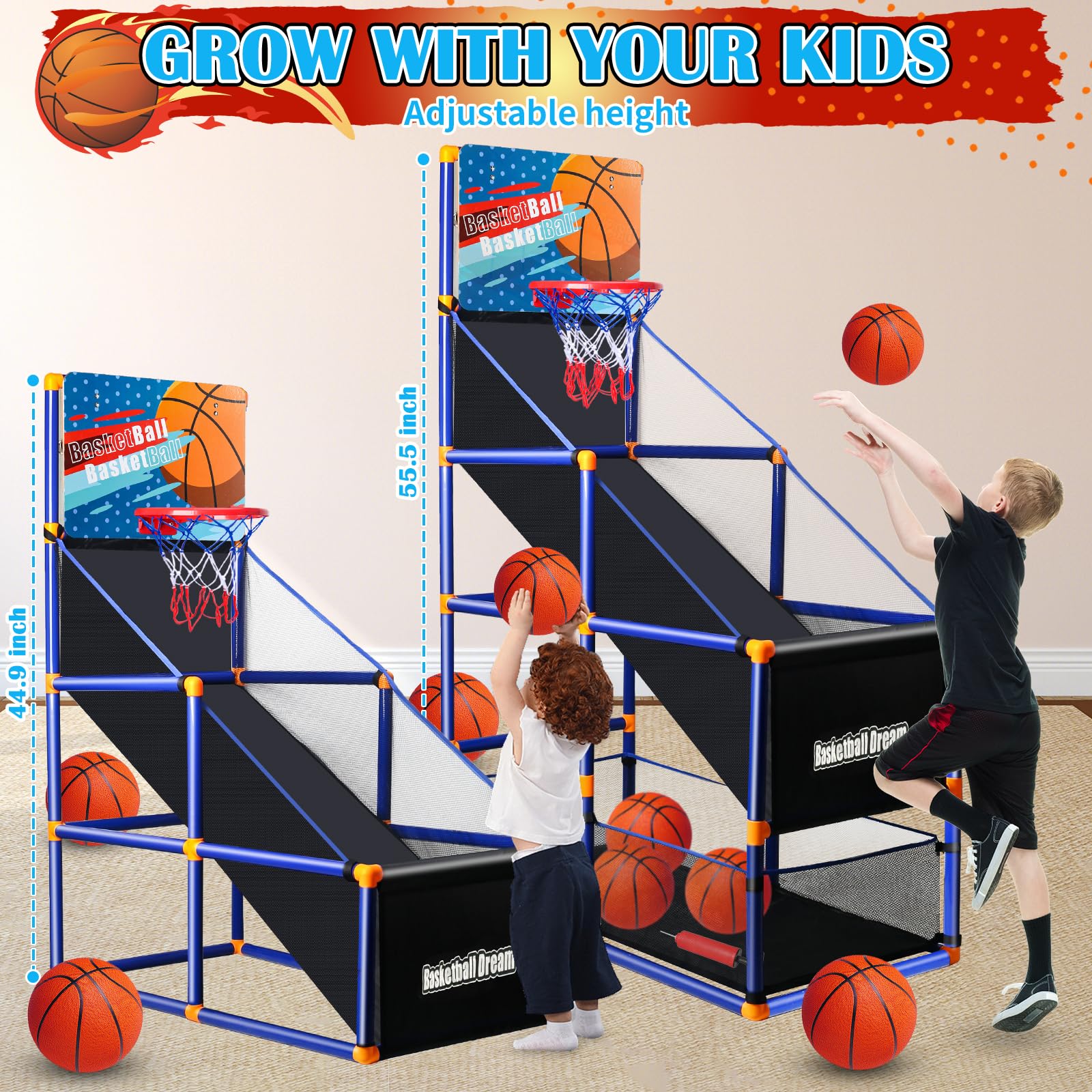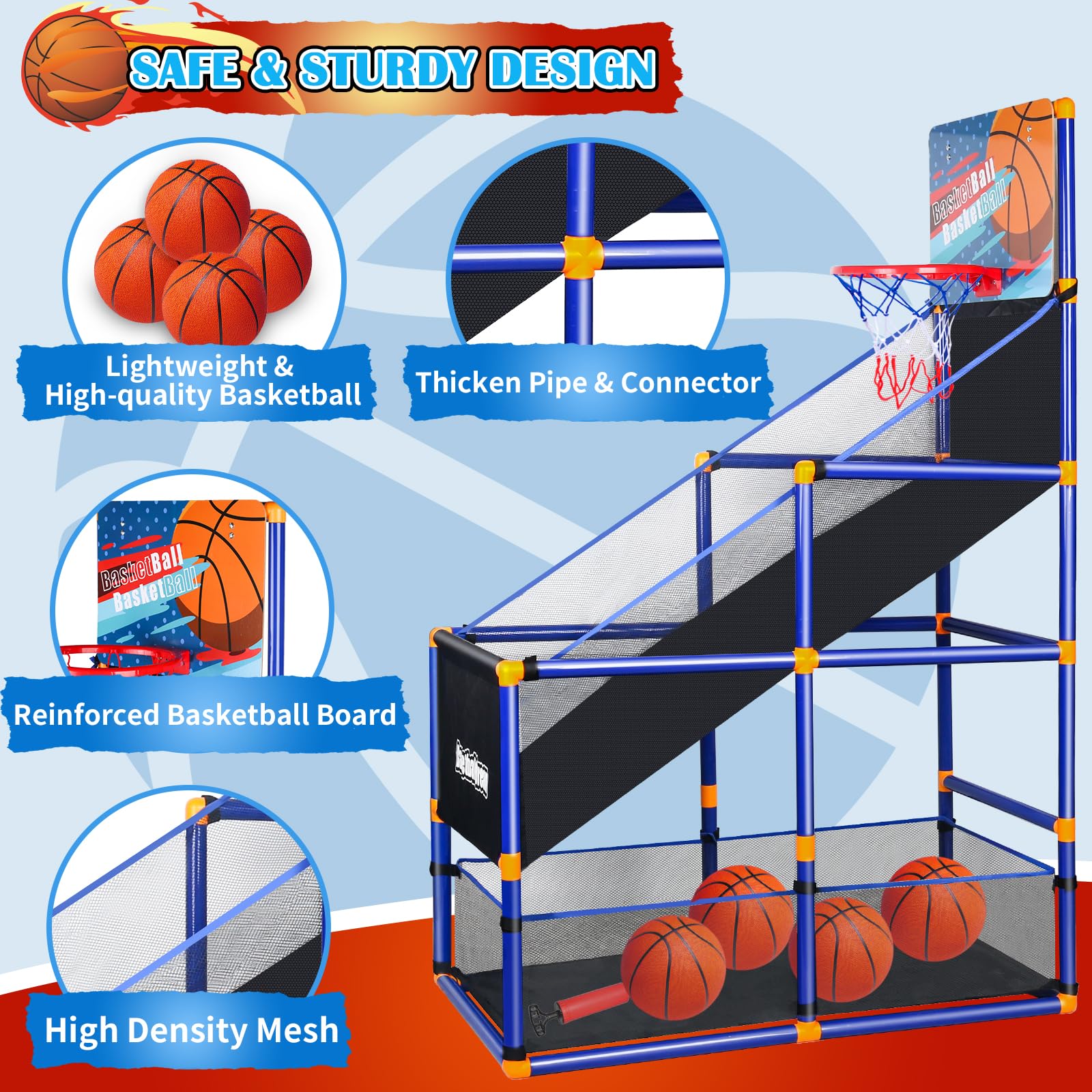 Upgraded Arcade Basketball Game Set: Our Kids Indoor Arcade Basketball Hoop Set Has 1 Basketball Board With Net, 4 Basketballs, 1 Pump, 1 Storage Mesh, 1 Clear Instruction And All Necessary Tools. Really Easy To Install And Take Apart Referring To The Clear Instruction. The Hight Of Basketball Goal Could Be Adjusted From 45Ft To 55.5Ft, So This Toddler Basketball Hoop Will Become A Great Friend For Kids Aged 3-8 In Different Heights.