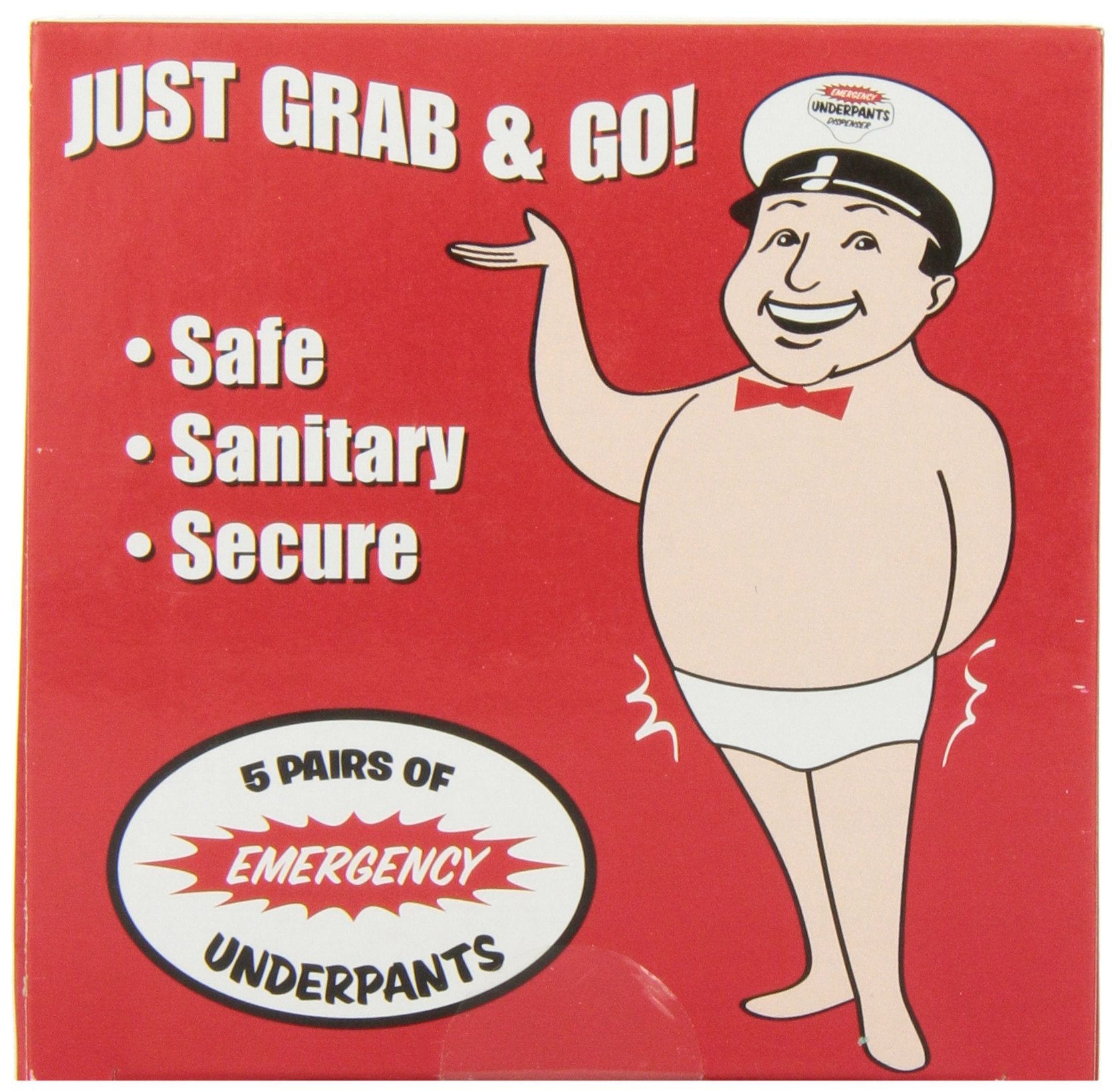 - Q: How many pairs of underpants are included in each dispenser? A: Each Emergency Underpants Dispenser contains five pairs of disposable underpants, ensuring you have enough for multiple emergencies.