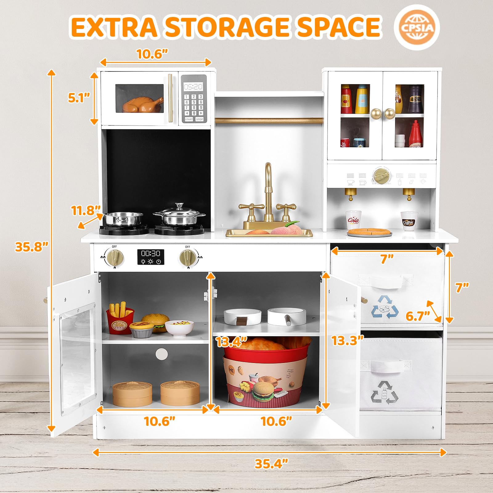 Arlopu Play Kitchen for Kids, Wooden Pretend Toy Kitchen, Large Toodler Cooking Playset w/Cookware, Stove w/Light & Sound, Fabri