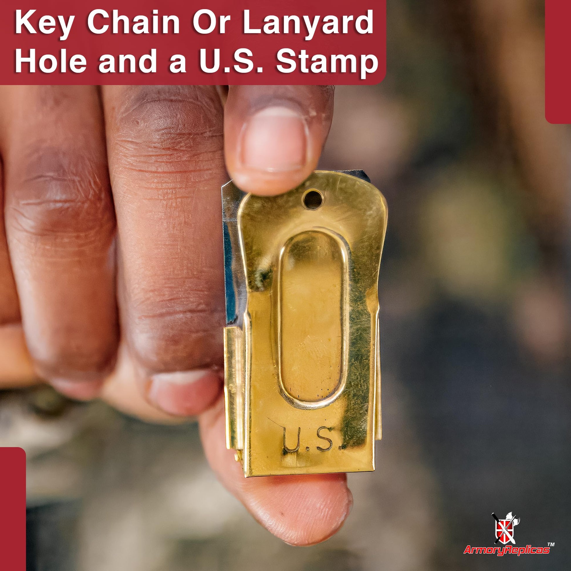 During the invasion parachutists soon learned that they had difficulty finding their comrades and communicating without being found out by the enemy. Upon approach, a click would be made using the tool, and friendly troops would respond with two clicks of their own. The clicker provides a distinct click sound when the tin backer was depressed against the brass body of the small 2 inch device. The top has an indenture for the thumb, a key chain or lanyard hole, and a U.S. stamp. This little reproduction played an important part in saving the lives of our US paratroopers and is a great keepsake to have.