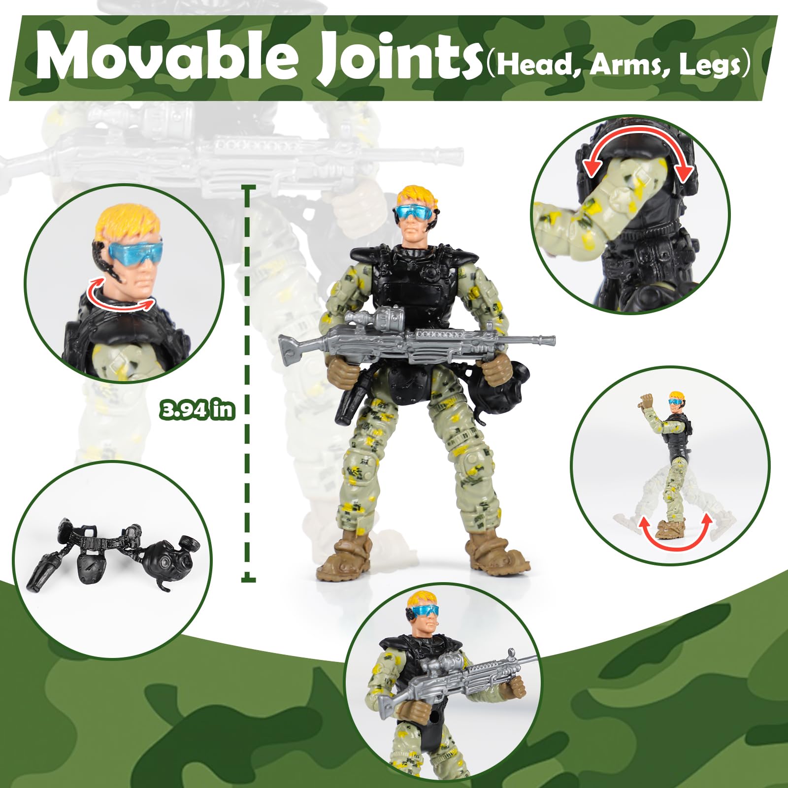 • Q: Can this playset help with children's development? A: Absolutely! The Army Men Action Figures Playset boosts imagination and creativity while enhancing cognitive development, hand-eye coordination, and motor skills as kids engage in strategic play and storytelling.