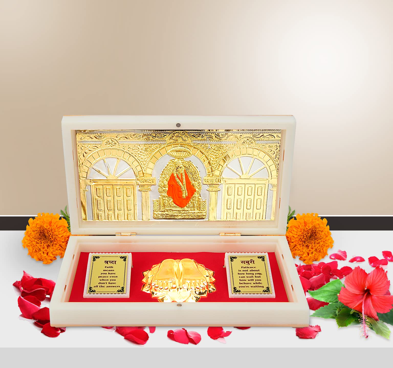 ARNAVIRA Gold Plated Photo Frame with Charan Paduka Pocket Temple for House Warming Gifts Return Gift Diwali Gift Puja Box (Shridi SaiBaba)