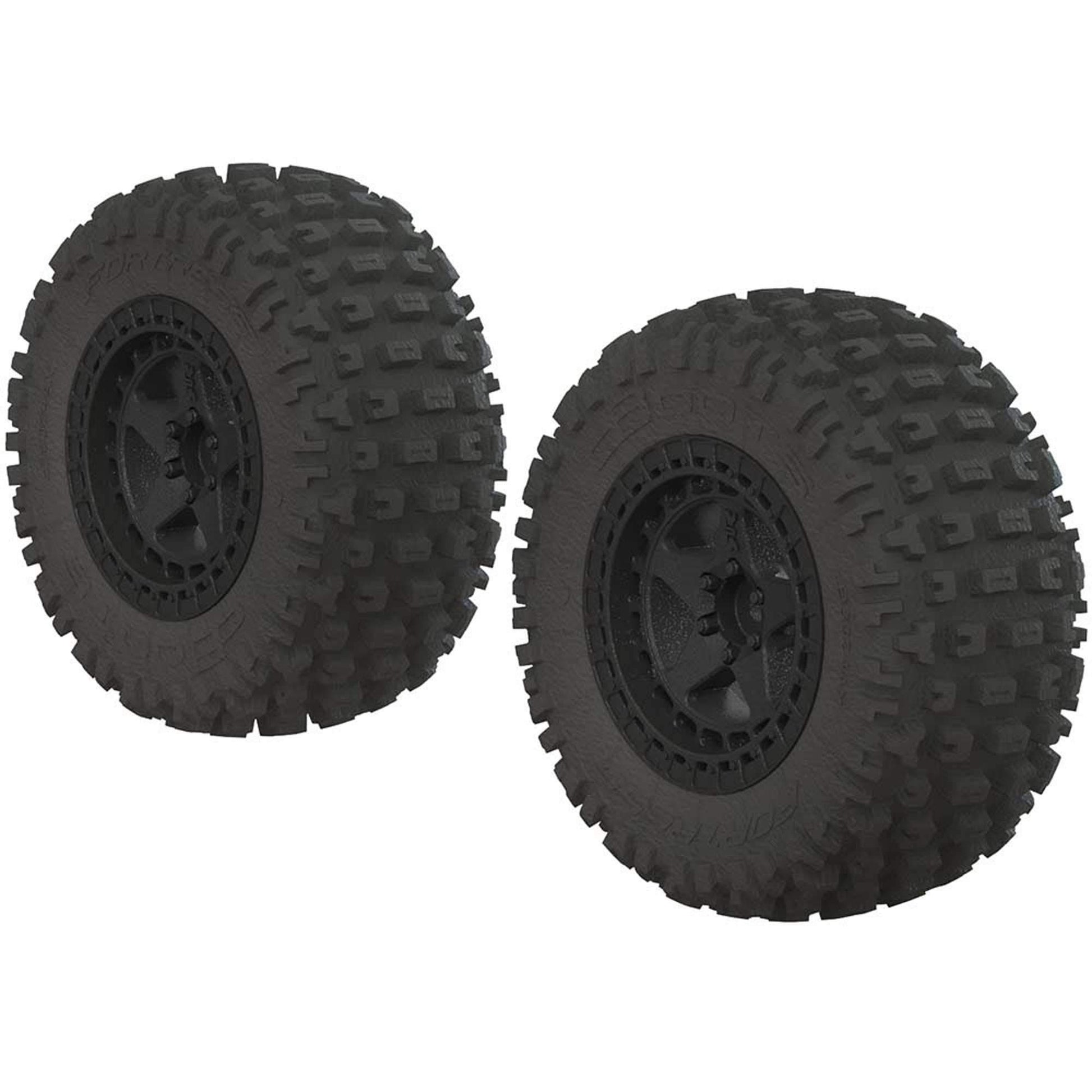 These high-quality dBoots FORTRESS SC tires, mounted on ARRMA wheels, are direct replacements for your kit items.Features:Tires: Multi-surface 'FORTRESS' tread pattern for awesome traction in all conditions - High-quality rubber for long-lasting durability - Pre-glued for trouble-free fit and fast servicing Wheels: Multi-spoke design for stylish looks and increased strength - tough nylon for durability on all surfaces - Black color for head-turning ARRMA styling - 14mm hex for strength during extreme driving action and easy servicing Foam Inserts: High-quality foam with excellent memory return - Specially designed to give the perfect balance of aggressive grip and easy handling characteristics TECHNICAL INFORMATION: Wheel inner bead diameter: 3.0'' (76mm) Wheel outer bead diameter: 2.2'' (56mm) Width: 1.7'' (42mm) Wheel hex size: 14mm Overall diameter: 4.1'' (104mm)Includes:2 x Black Wheels with pre-glued dBoots FORTRESS tires and foam inserts