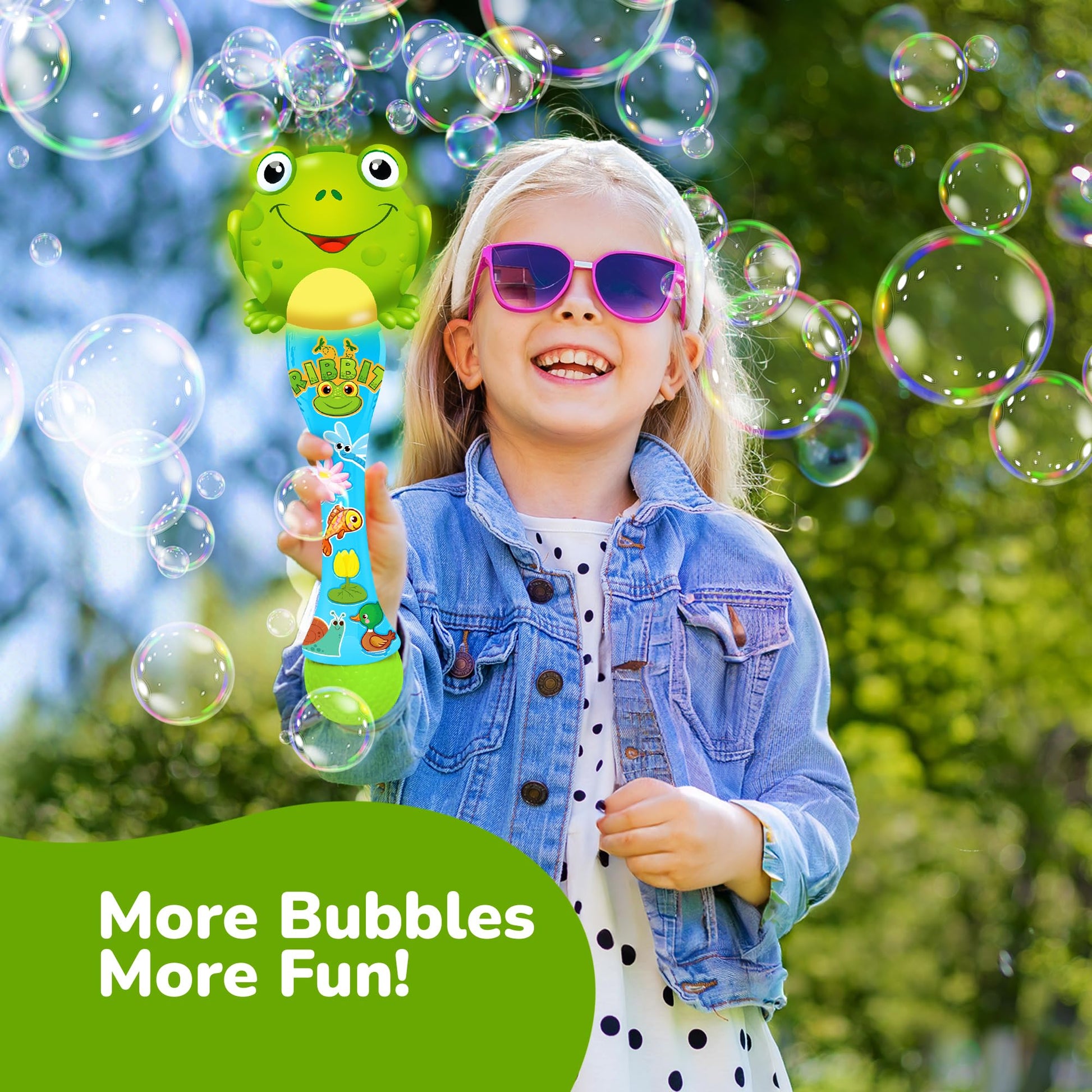 BUBBLY FUN WITH A FROG TWISTPond AdventuresBring the magic of playful ponds to life with this one-of-a-kind frog bubble wand! Designed to captivate it features fun elements like cheerful music and bright lights for a lively playtime experience. Complete with a bonus sticker sheet featuring 22 adorable pond-themed stickers it inspires endless creativity. Kids will love the vibrant frog design while parents will appreciate the included bubble liquid and batteries making it ready for instant fun.Perfect GiftLooking for a unique gift that inspires creativity and active play? This frog bubble wand is the perfect choice! Its cheerful music flashing lights and adorable frog design keep kids entertained while reducing screen time. The included sticker sheet adds extra fun with 22 pond-themed stickers sparking imagination and hands-on activities. Complete with bubble liquid and batteries its ready for hours of entertainment straight out of the box. Go ahead give the gift of joy and playfulness!Heres why youll love this frog wand:- Handcrafted green frog bubble wand with vibrant details.- Includes 22 pond-themed stickers for added fun.- Plays cheerful music and flashes bright lights.- Comes with bubble liquid batteries and instructions.- Encourages active play and less screen time.- Great gift for birthdays and parties.Go ahead spark joy and creativity with this adorable frog bubble wand!