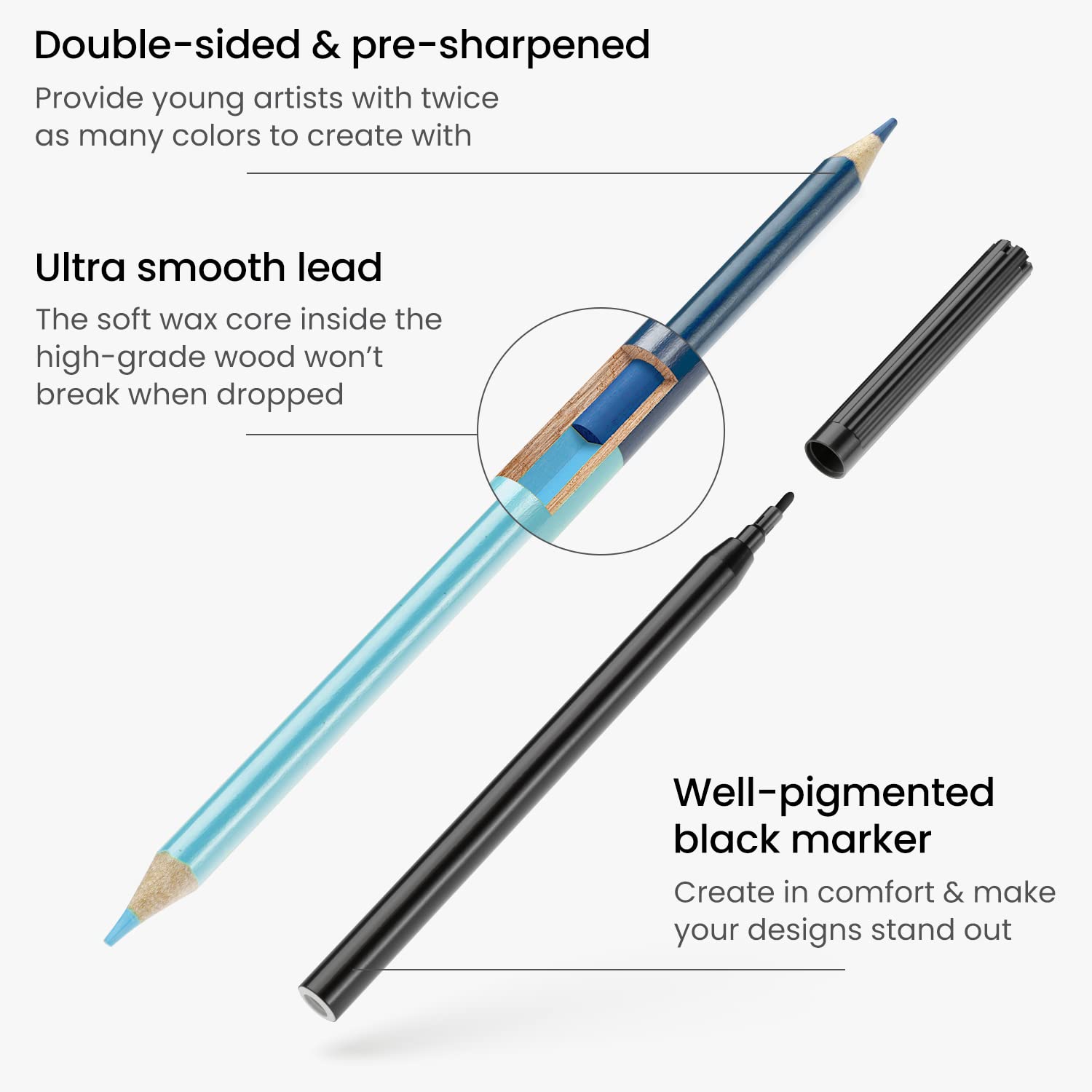 Kids Can Unwind with Our Arteza Color-by-Number Coloring Activity KitThe process of coloring can be used to create space for reflection, calming down, and unwinding. We created 50 unique double-sided coloring sheets for your child to completely unwind or take a break from screen time.Our kids coloring book set also comes with 12 double-sided pencils that we designed to be smooth and highly pigmented, making blending, layering, and mixing colors a breeze.This set also comes with a nontoxic black marker, one eraser, and one pencil sharpener.What We Love About Our Arteza Kids Coloring Book Set:-Designed with your childs learning and imagination development in mind.-Illustrations are printed on bleed-resistant paper.-All art supplies included are nontoxic.Our Arteza Guarantee to YouHere at Arteza, we care about our customers and we are passionate about creating products that inspire. We strive to create products that make us proud.If you have any issues with our products, please reach out and well make it right.