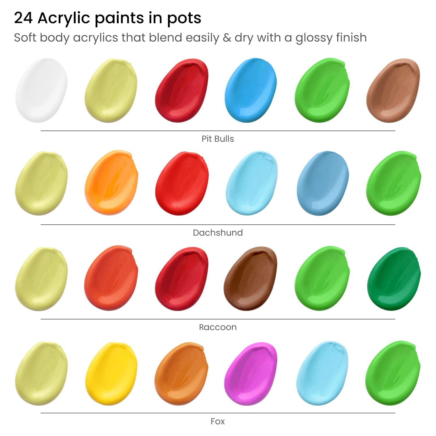 Bring the Beauty of the Magic World to Your Childs FingertipsThis vibrant and engaging painting set is designed for aspiring artists 6 years old and up.Each pre-drawn canvas has its own paint set, brush, and painting palette.Our safe and washable paints help to nurture budding artists with hours of creative fun.Use this set at your childs next party or playdate to teach them about color and to inspire creativity.Each set comes with:- 4 x Pre-printed canvases (8 x 8 inches)- 24 x Acrylic paint pots (5 ml each)- 4 x Brushes- 4 x Palettes- 4 x Color reference guidesEach of the four different stretched canvas designs depicts a different Animals.This allows your little one to learn about beautiful colors and Animal World.The brushes and acrylic paints are easy to clean up.With our paint for kids, your child can explore the fantastic world of Animals.Bring the Animal life to your childs room.Our Arteza Guarantee to YouHere at Arteza, we care about our customers, and we are passionate about creating products that inspire.If you have any issues with our products, please reach out and well make it right.