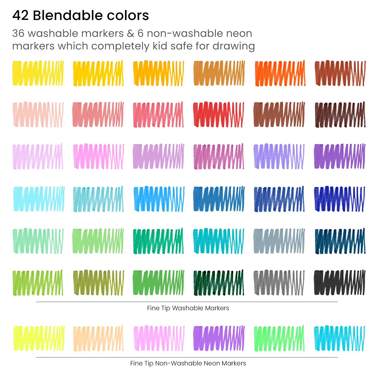 ARTEZA Kids Fine Tip Washable Markers, 42 Bright Colors, 36 Washable Marker Pens and 6 Non-Washable Neon Pens, School Supplies f