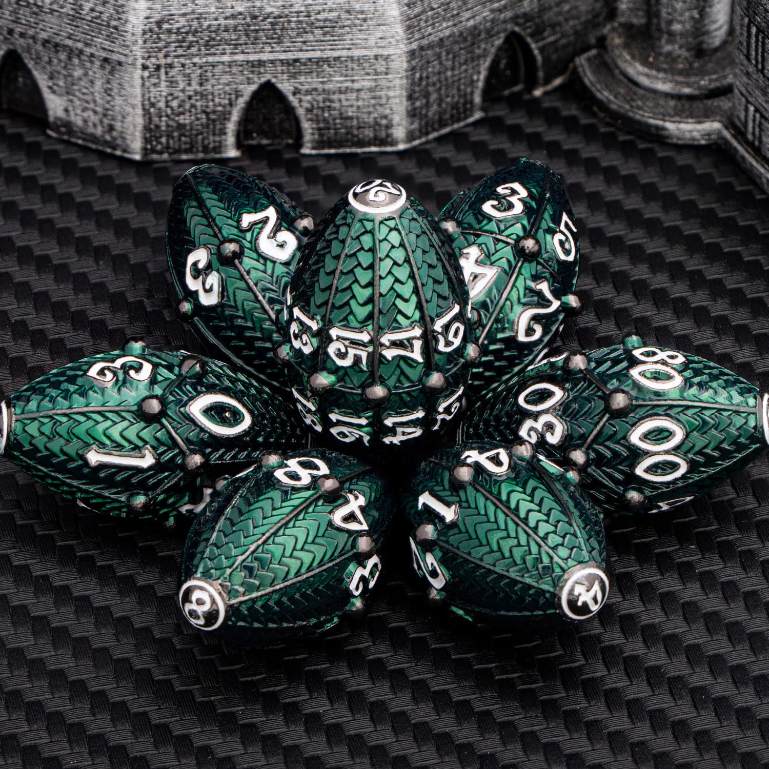 - Q: What materials are used in the manufacturing of these dice? A: These dice are made from high-quality metal, ensuring durability and a smooth roll. The craftsmanship includes detailed scale engravings and a reliable rotating mechanism, providing both functionality and aesthetic appeal for avid gamers.