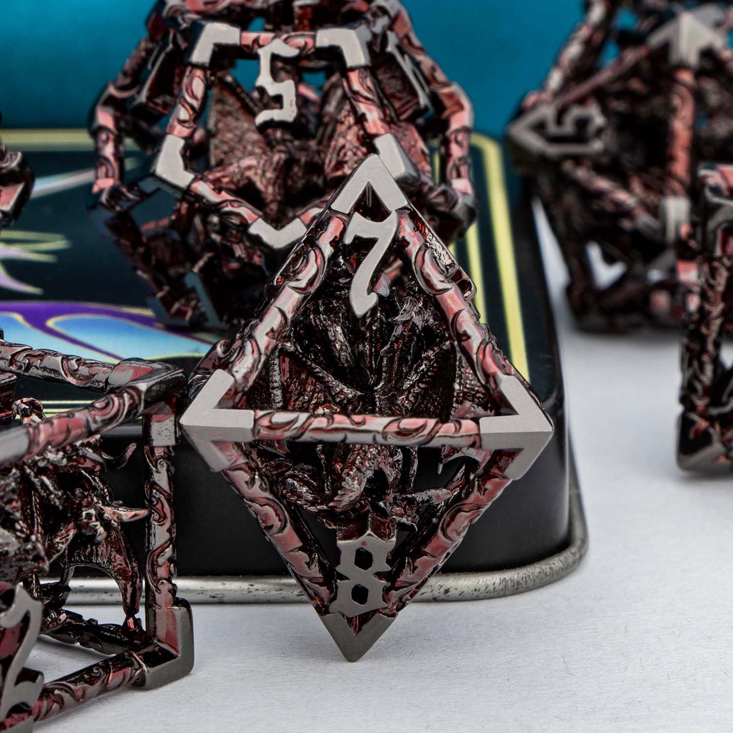 - Q: What is the significance of the design inspiration from Tiamat? A: The design of the dice is inspired by Tiamat, a powerful five-headed dragon in the D&D universe, symbolizing the strength and uniqueness of the dice set.