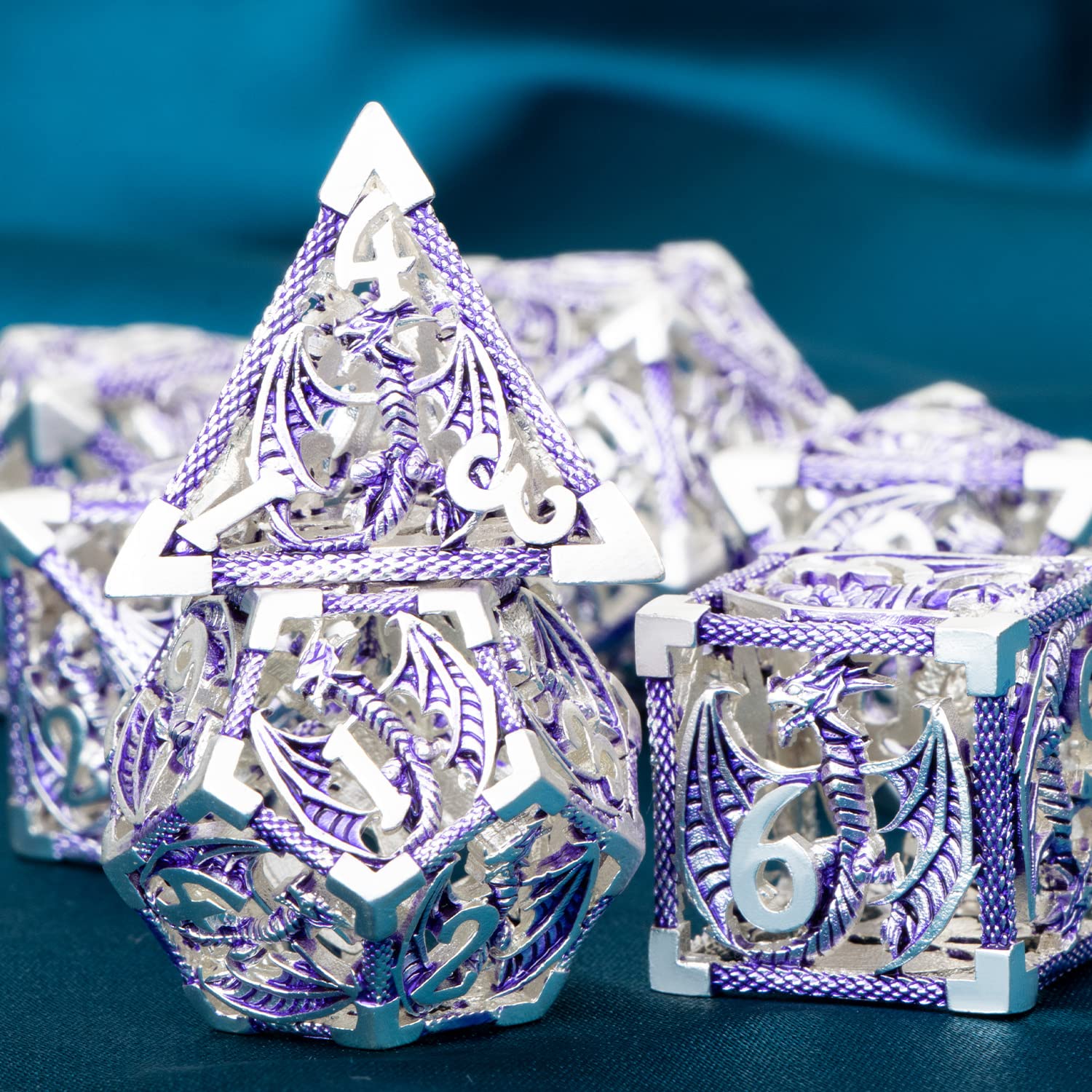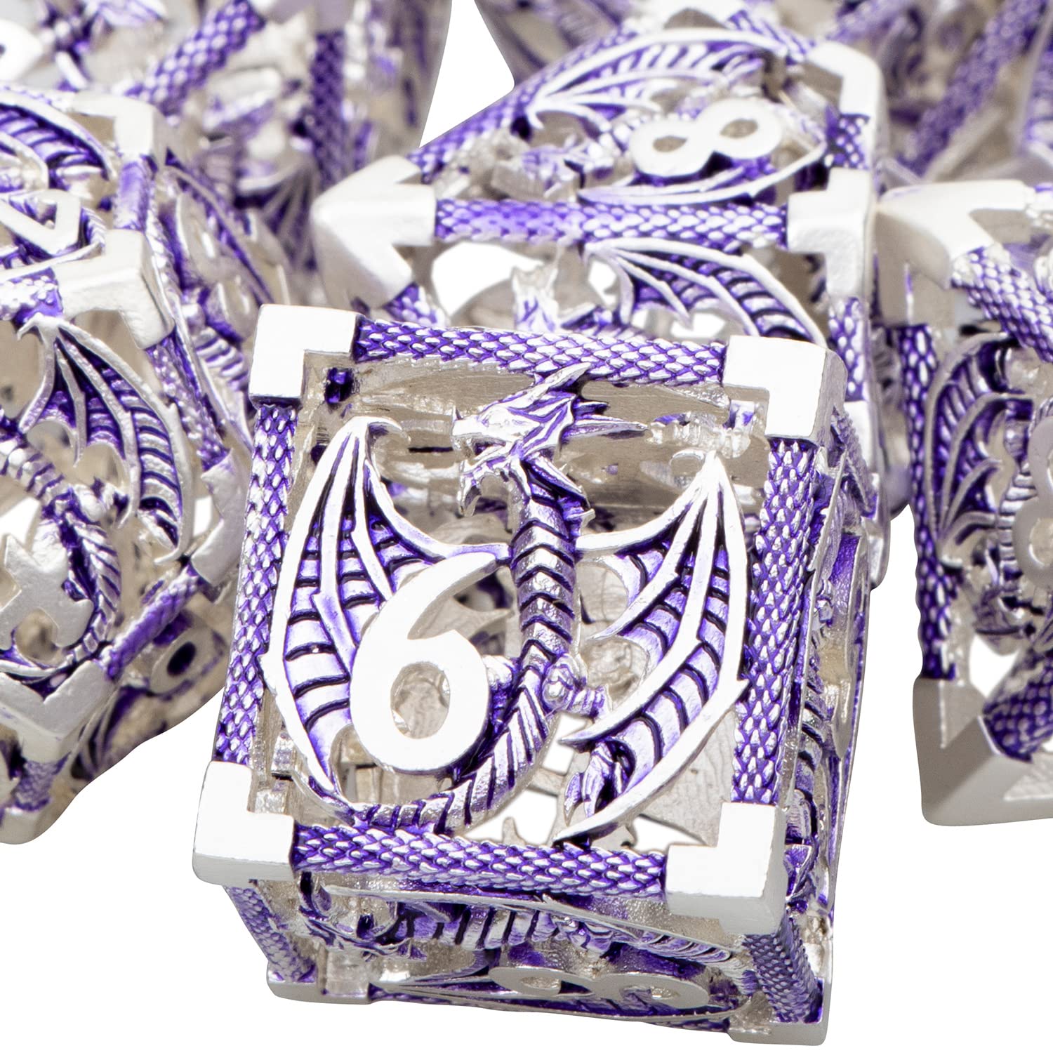 ARUOHHA Hollow DND Metal Dice Set Purple Dungeons and Dragons Dice with Gift Box, Large Role Playing Games Dice 7PCS D+D Polyhed
