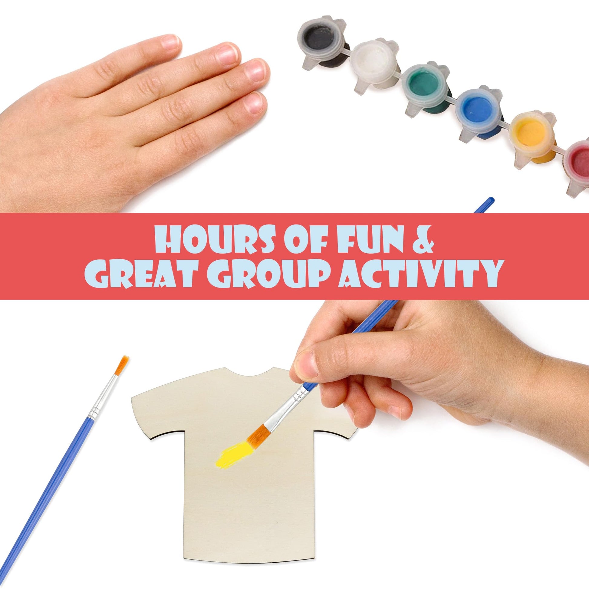 Attatoy Wood Jersey Shirts Craft Set (32-Piece Party Pack Set) Ignite your childs creativity and passion for sports with our incredible craft set, specially designed for children ages 5 and up! Inside this exciting kit, youll find 25 blank wooden sports jerseys just waiting to be transformed into works of art. This includes 25 unfinished shirts, 4 paint brushes, 1 set of jersey number stencils, and 2 sets of paint. With these, your children can craft personalized sports-themed decorations, ornaments, or even heartfelt gifts that showcase the colors of their favorite sports team. This craft set is not only perfect for solo creativity but also ideal for sports-themed parties, family events, or fun nights with friends. Watch as your childs imagination runs wild, and they proudly display their sports fandom in a unique and personalized way. FEATURES Wood Jersey Size: 5 in. tall x 3.25 in. wide x 0.12 in, thick (12.7 x 8.25 x 0.3 cm.) Color: Unfinished natural wood, paint colors include red, yellow, blue, green, white, and black Material: Paulownia wood, paint, plastic Includes: 25 wooden jersey cutout shapes, four paint brushes, one sheet of number stencils, and two sets of paint (6 colors each) Recommended for ages 5 and up