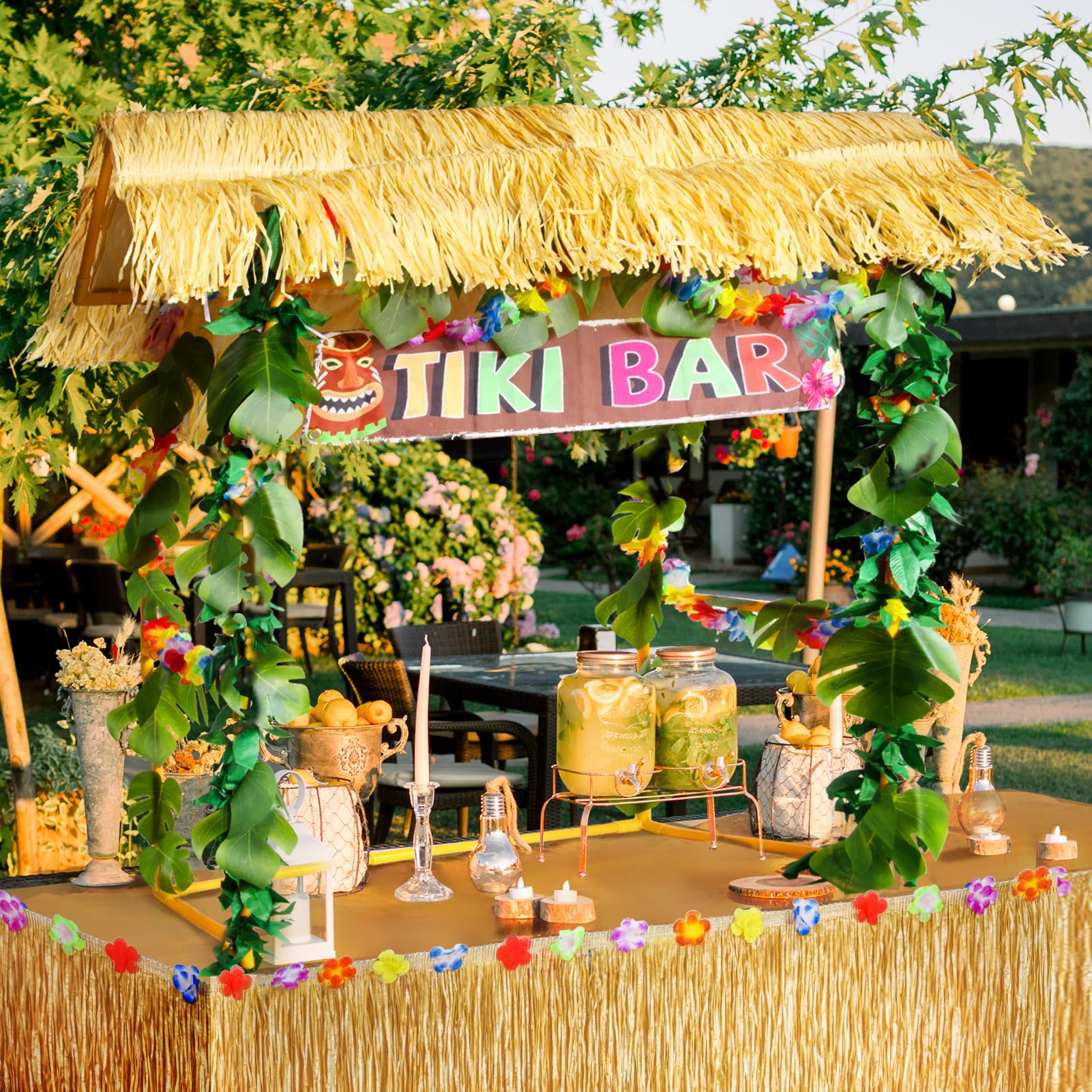 Auihiay 50Pcs Tiki Bar Hut Kit, Tiki Hut Decoration Includes Tiki Bar, Banner, Roof, Palm Leaves, Flower Garland And Table Skirt, Great Hawaiian Pool Beach Luau Party Decor Supplies